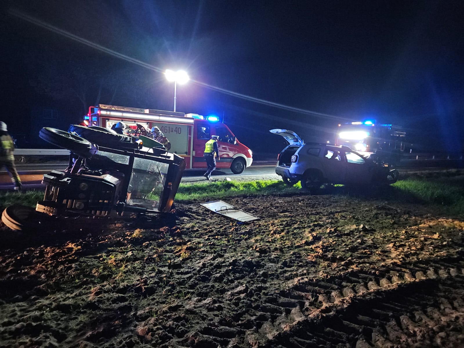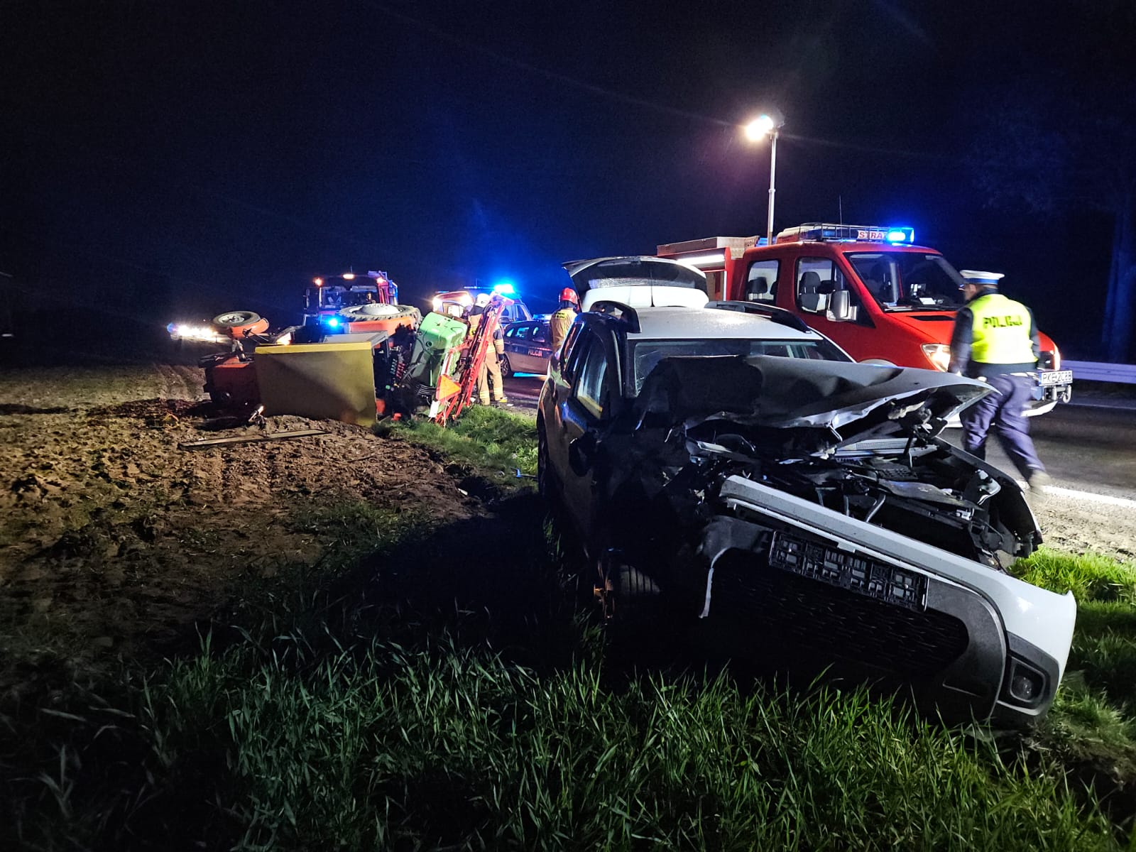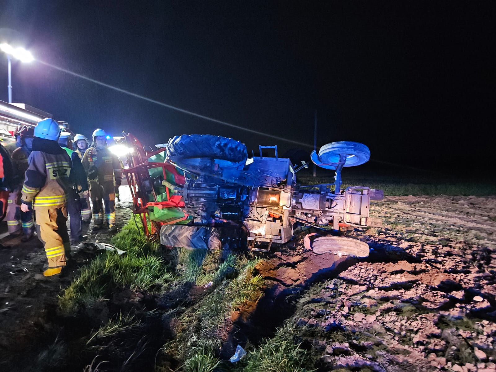 Po dotarciu na miejsce zdarzenia pierwszych zastępów stwierdzono, że doszło do zdarzenia samochodu osobowego z ciągnikiem rolniczym. W wyniku zderzenia ciągnik rolniczy wypadł z jezdni przewracając się na bok. Kierujący ciągnikiem wymagał pomocy medycznej.