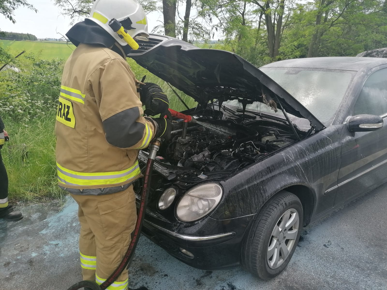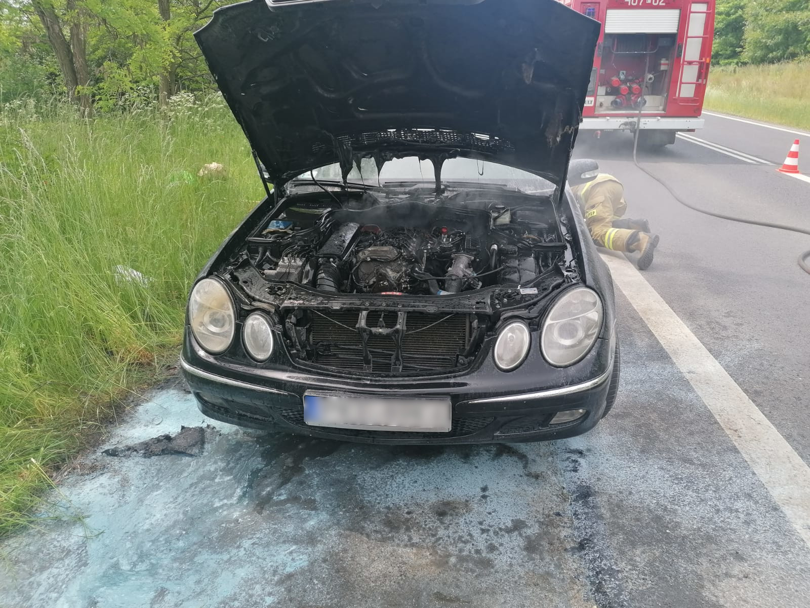 Po dotarciu na miejsce zdarzenia stwierdzono pożar komory silnika samochodu osobowego. Kierowca znajdował się poza pojazdem i nie wymagał pomocy medycznej.