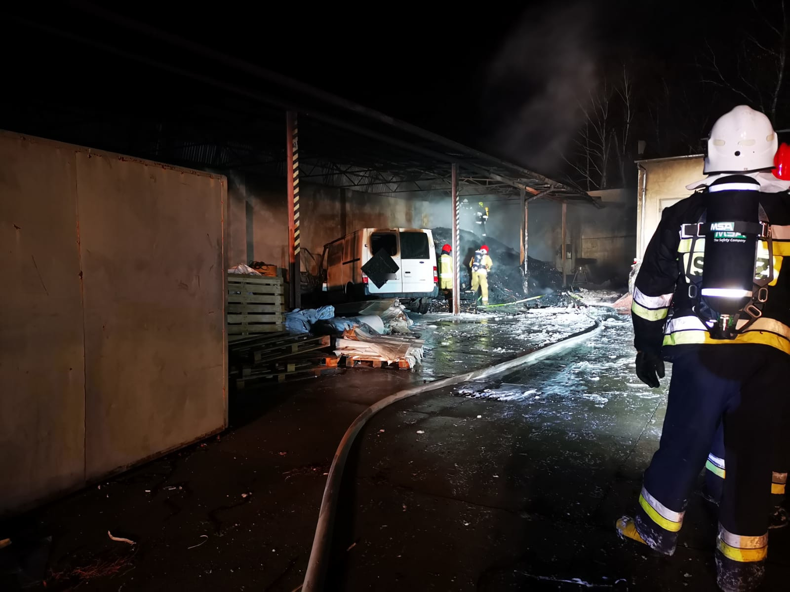 Po dotarciu na miejsce zdarzenia stwierdzono rozwinięty pożar wiaty magazynowej, w której znajdowały się duże ilości tworzyw sztucznych oraz samochód dostawczy. Po przeprowadzeniu rozpoznania nie stwierdzono osób wymagających pomocy medycznej.