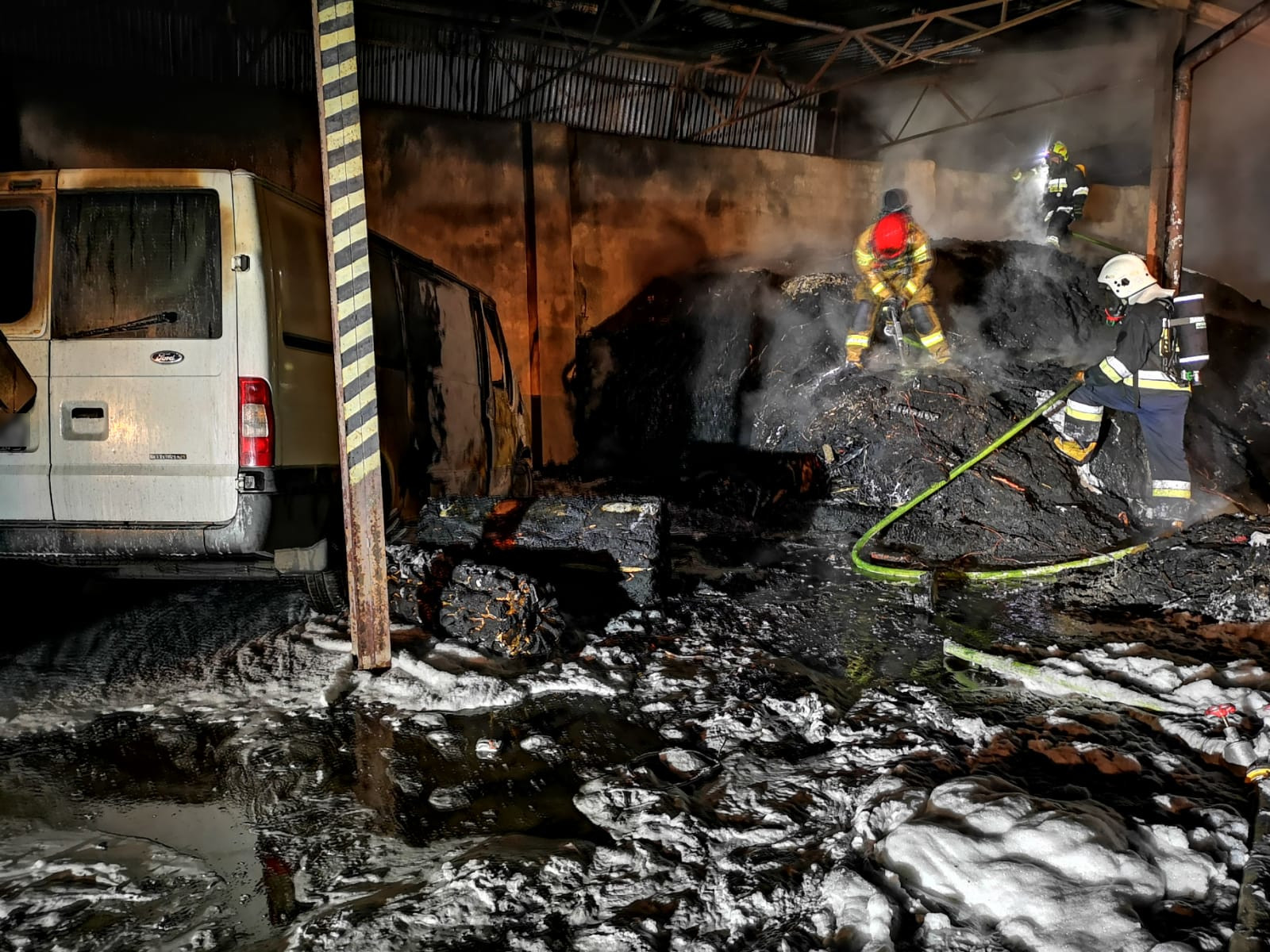 Działania straży polegały na zabezpieczeniu miejsca zdarzenia, następnie odłączono zasilanie w obiekcie, podano 3 prądy wody oraz jeden prąd piany ciężkiej w natarciu na pożar i obronie na przyległe budynki. Ratownicy pracowali w sprzęcie ochrony układu oddechowego. Na sąsiedniej posesji ewakuowano pojazdy, które znajdowały się w pobliżu wiaty. Powyższe działania doprowadziły do lokalizacji pożaru. Dogaszanie oraz przelewanie kontynuowano z wykorzystaniem lanc gaśniczych ze względu na utrudniony dostęp do głębszych warstw tworzywa (zewnętrzna warstwa uległa stopieniu tworząc twardą skorupę). Całe składowisko sprawdzono kamerą termowizyjną - zagrożenia nie stwierdzono. Na tym działania zakończono.