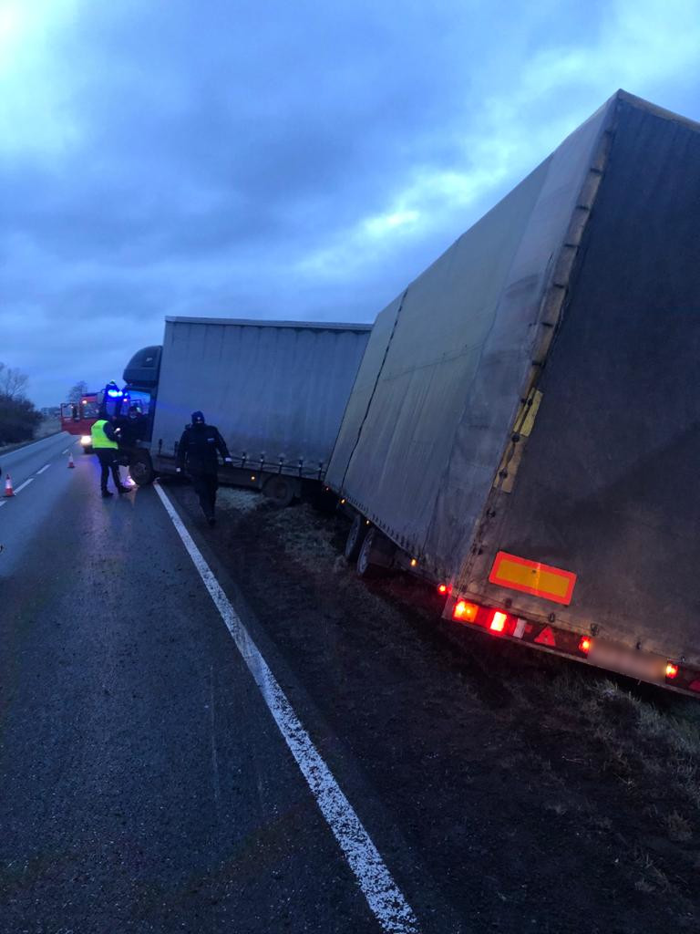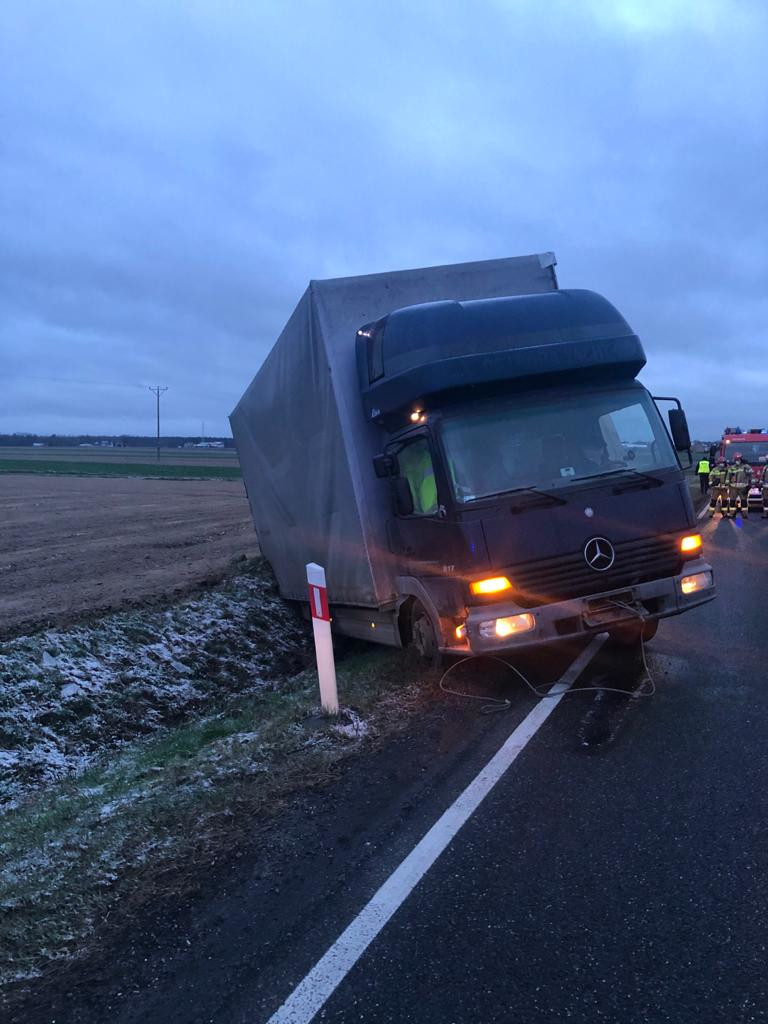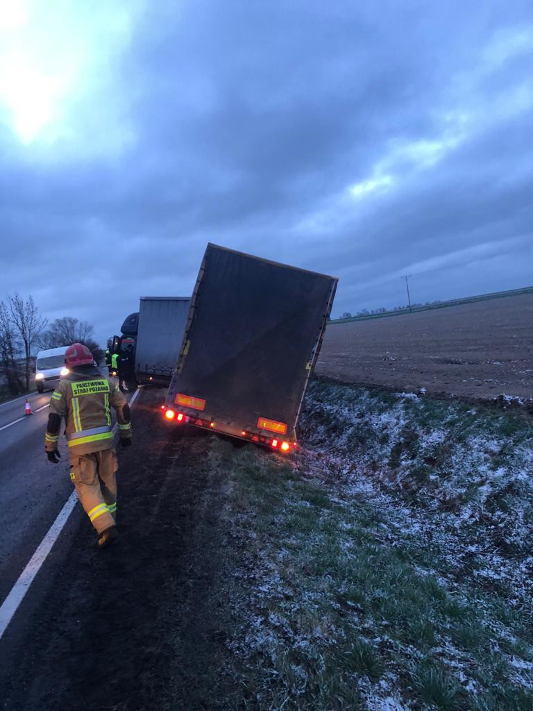 Po przybyciu na miejsce zdarzenia pierwszych zastępów stwierdzono, że na 454 km drogi krajowej DK11 samochód ciężarowy z przyczepą wjechał do rowu blokując jeden pas ruchu.