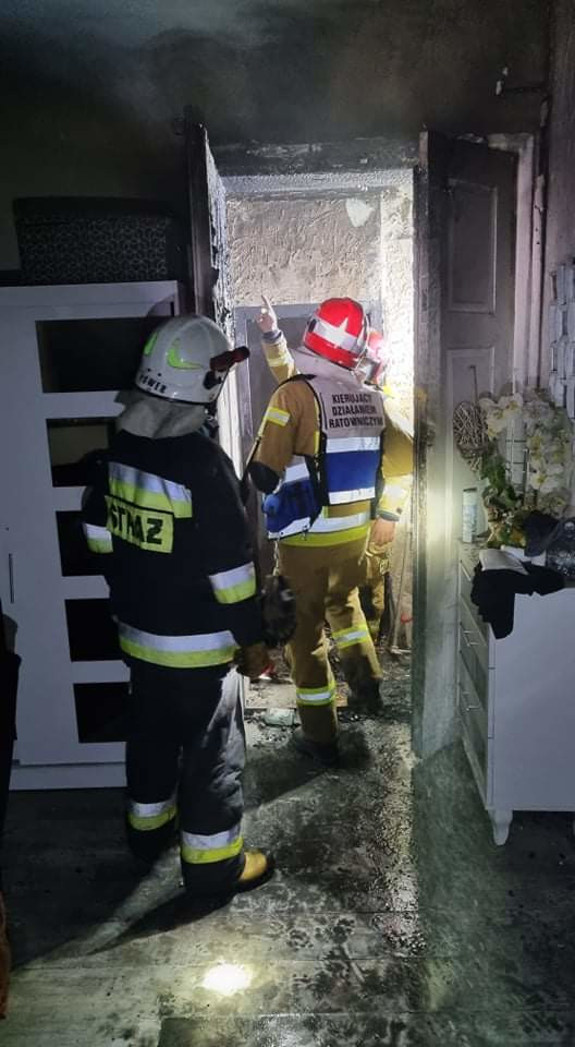 Działania strażaków w pierwszej fazie polegały na zabezpieczeniu miejsca zdarzenia, odłączeniu zasilania w energię elektryczną od budynku oraz podaniu jednego prądu gaśniczego w natarciu na pożar. Strażacy pracujący w aparatach ochrony układu oddechowego równocześnie z działaniami gaśniczymi przeszukiwali pomieszczenia objęte pożarem. Z mieszkania ewakuowano jedną osobą, której w strefie bezpiecznej udzielono kwalifikowanej pierwszej pomocy. W trakcie prowadzonych działań do ratowników zgłosiła się druga osoba, matka osoby poszkodowanej będąca pod wpływem zdarzenia, zamieszkująca w lokalu pod mieszkaniem, w którym wybuchł pożar. Z budynku przed przybyciem służb ewakuowało się łącznie 12 osób. Osoby poszkodowane zostały przekazane przybyłemu na miejsce zdarzenia zespołowi Pogotowia Ratunkowego.