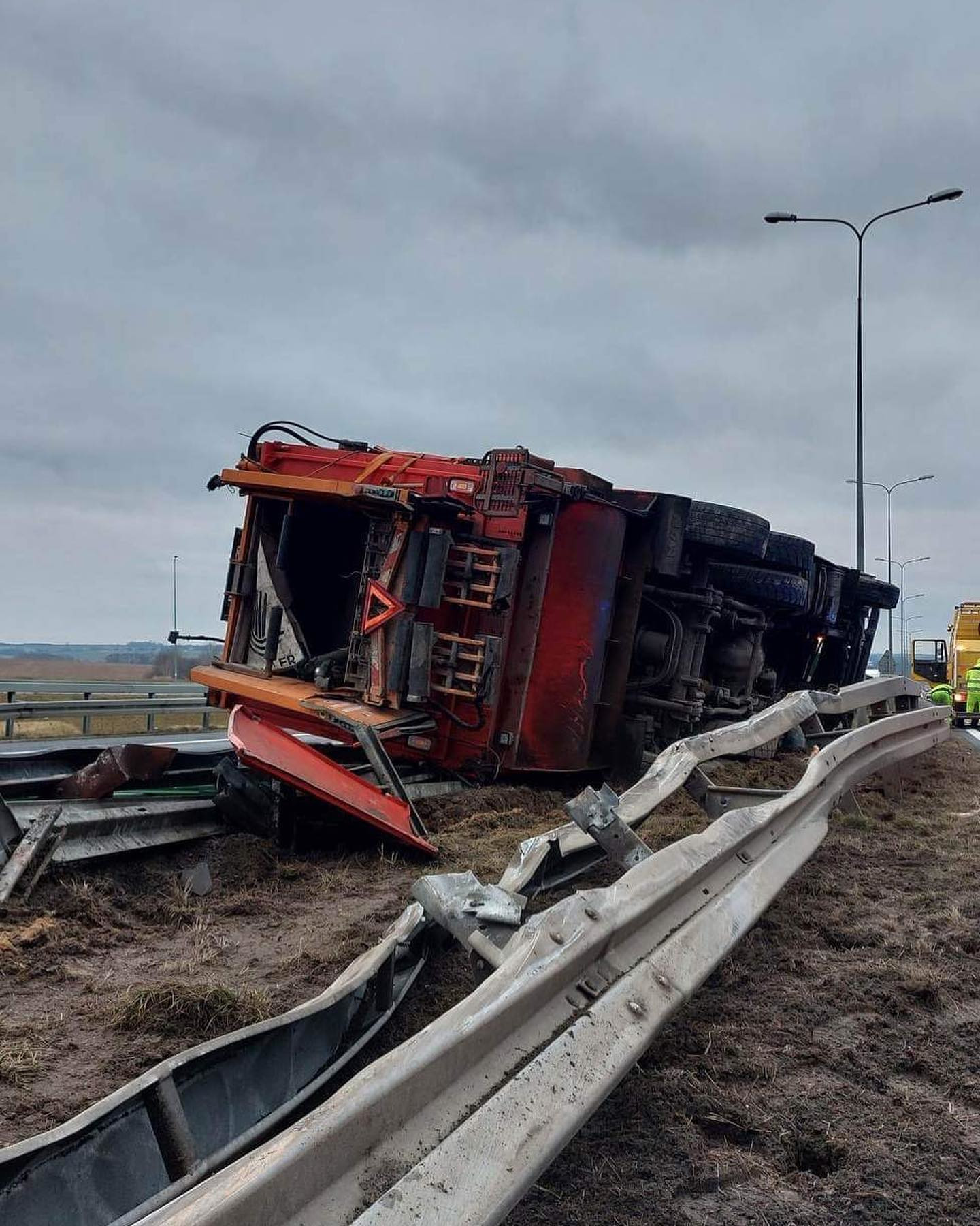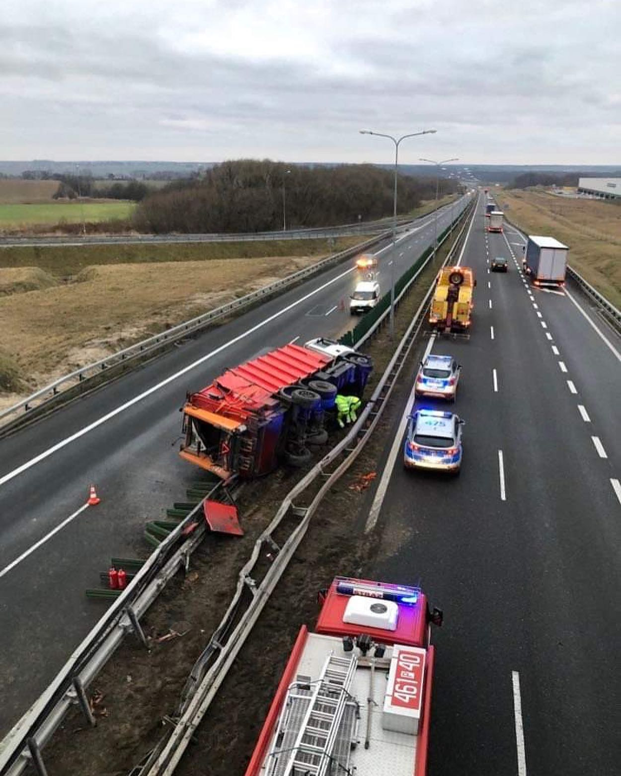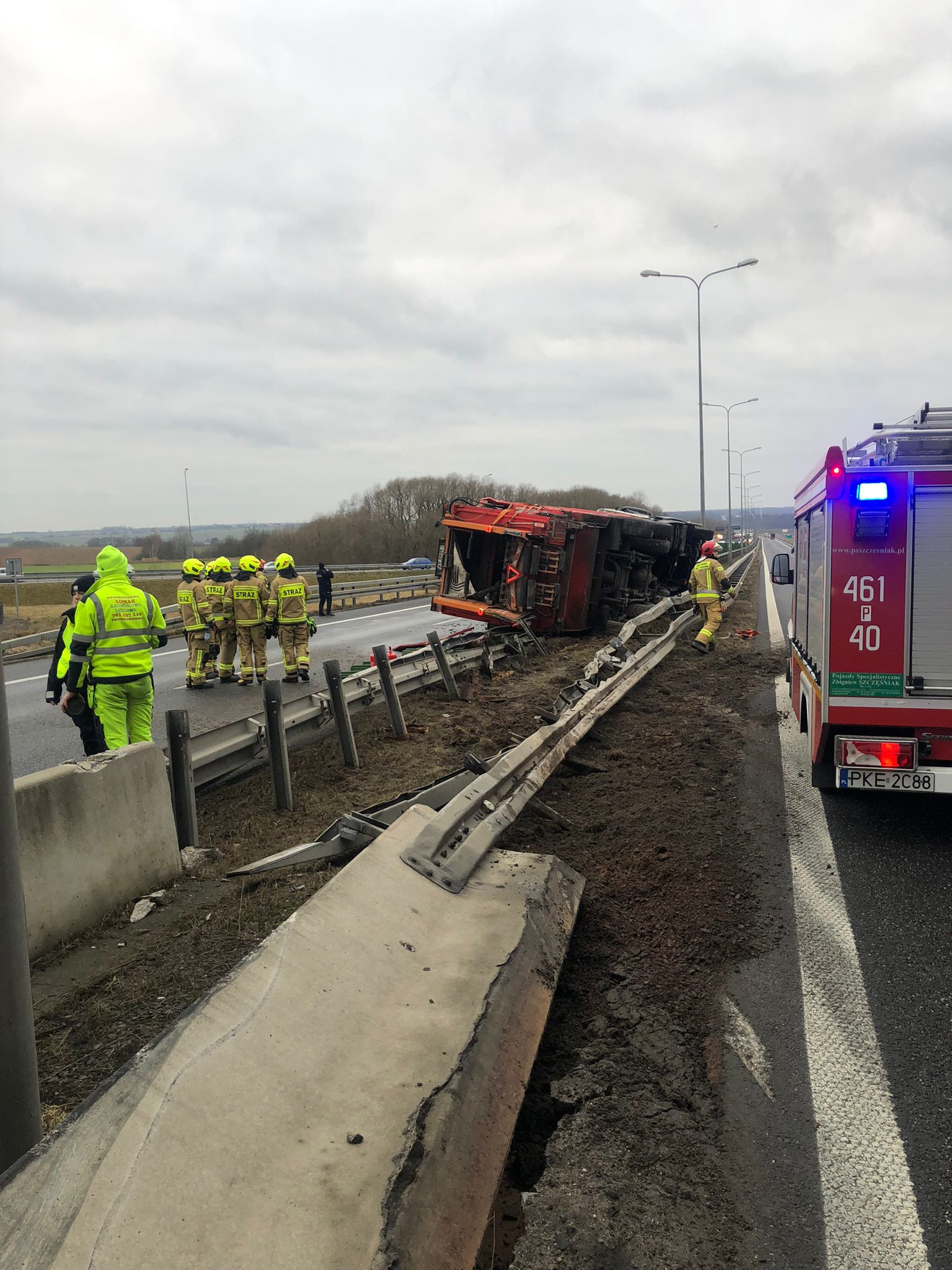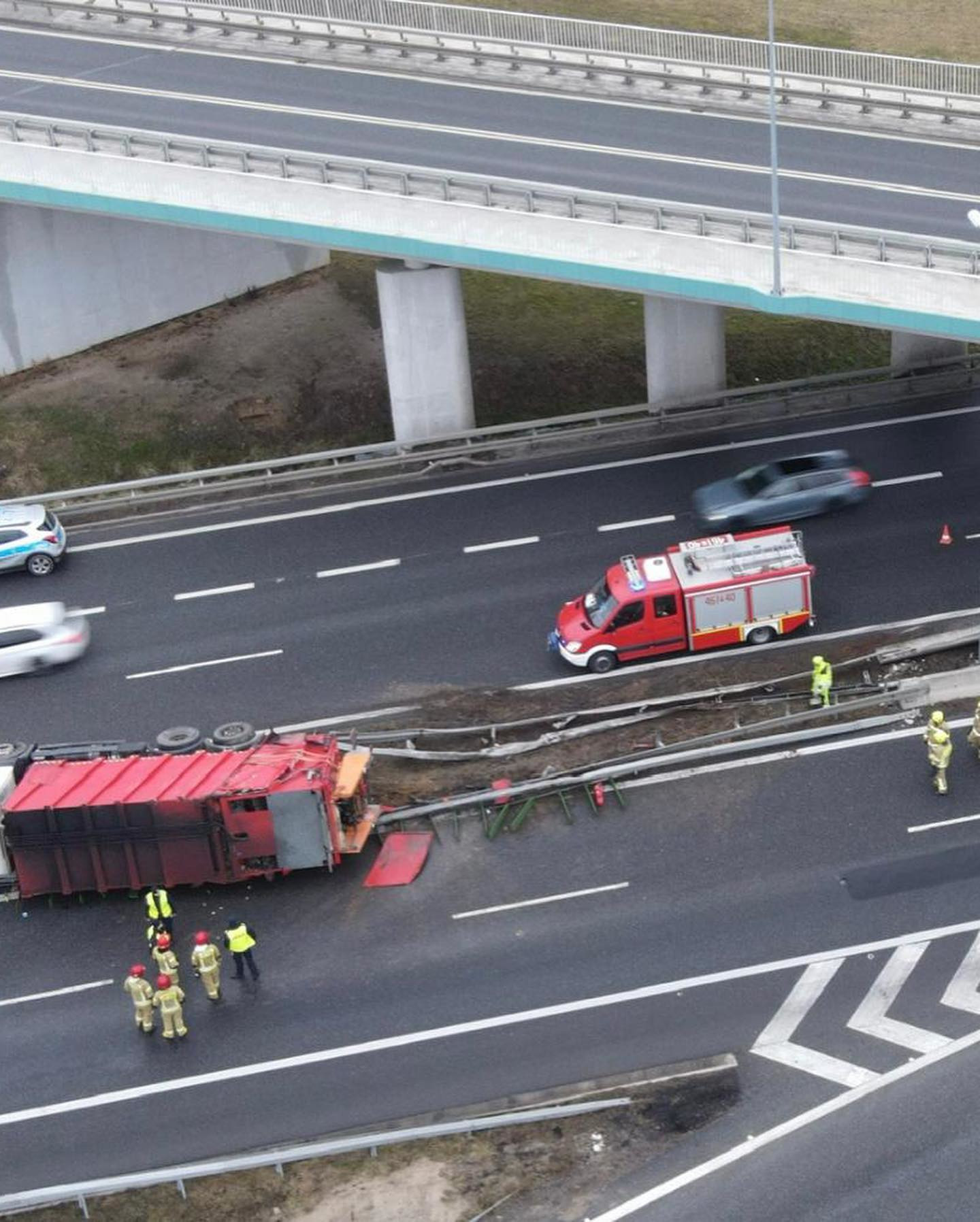 Po dotarciu na miejsce zdarzenia stwierdzono, ze pojazd do wywozu odpadów wypadł z jezdni i przebijając bariery energochłonne przewrócił się na bok. Na potrzeby działań zablokowano po jednym pasie w kierunku Warszawy i Wrocławia. Po przeprowadzeniu rozpoznania ustalono, że pojazd w momencie zdarzenia był ciągnięty przez holownik. Nie stwierdzono osób wymagających pomocy medycznej.