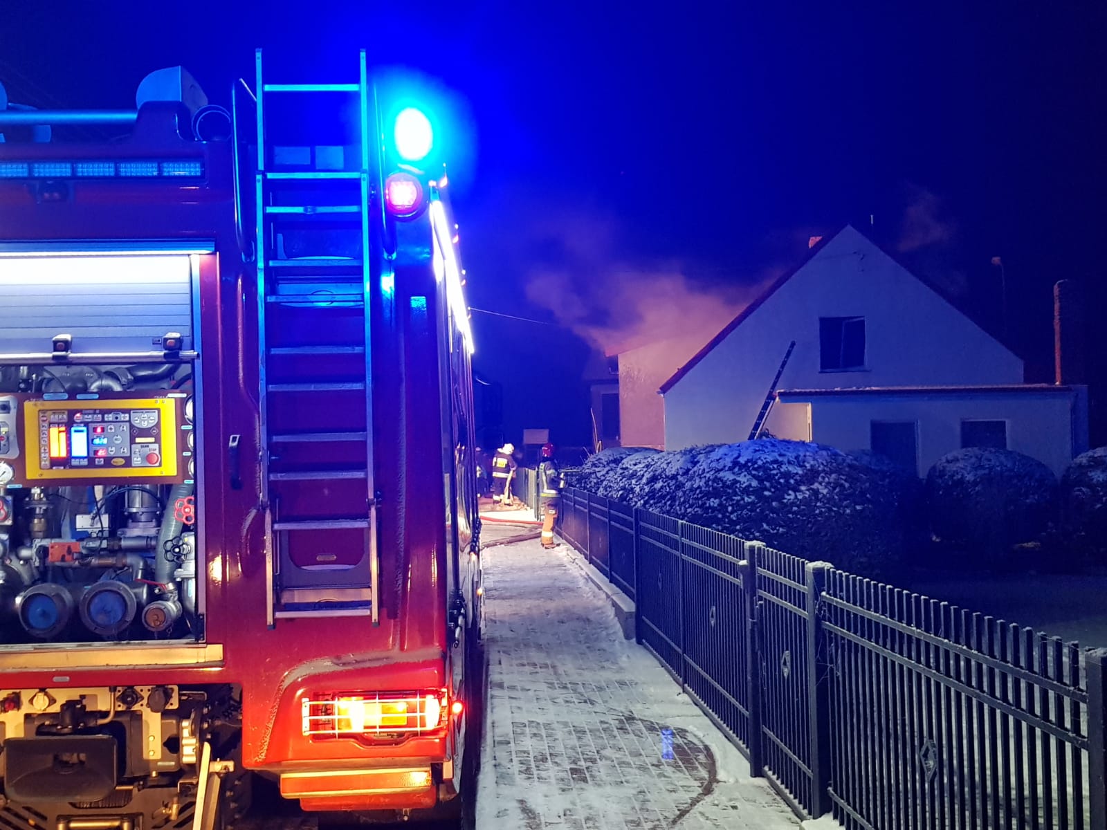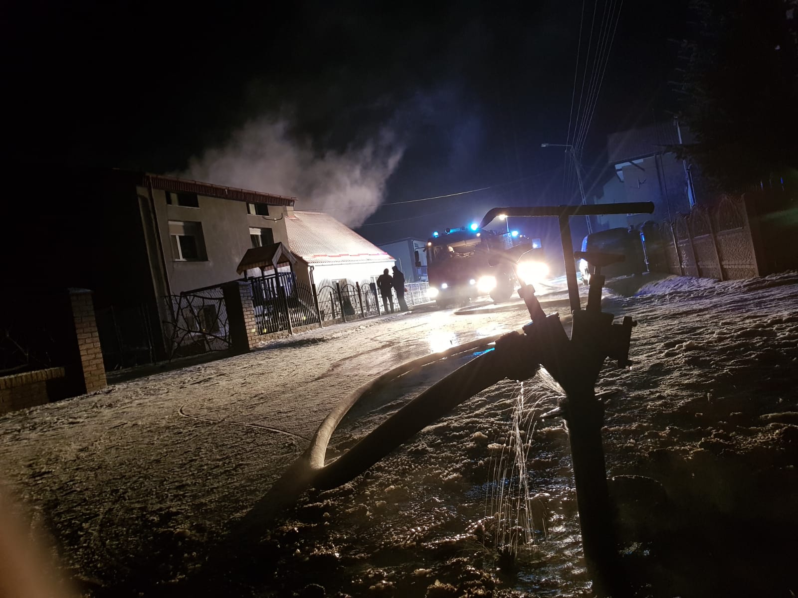 Po dotarciu na miejsce zdarzenia pierwszych zastępów stwierdzono rozwinięty pożar w budynku mieszkalnym z garażem. Pożarem objęta była cześć garażowa, część mieszkalna oraz poddasze budynku. Mieszkańcy ewakuowali się przed przybyciem służb. Podjęli również próbę gaszenie pożaru za pomocą podręcznego sprzętu gaśniczego. Czynnikiem utrudniającym dziania była bardzo niska temperatura dochodząca do -14 °C.