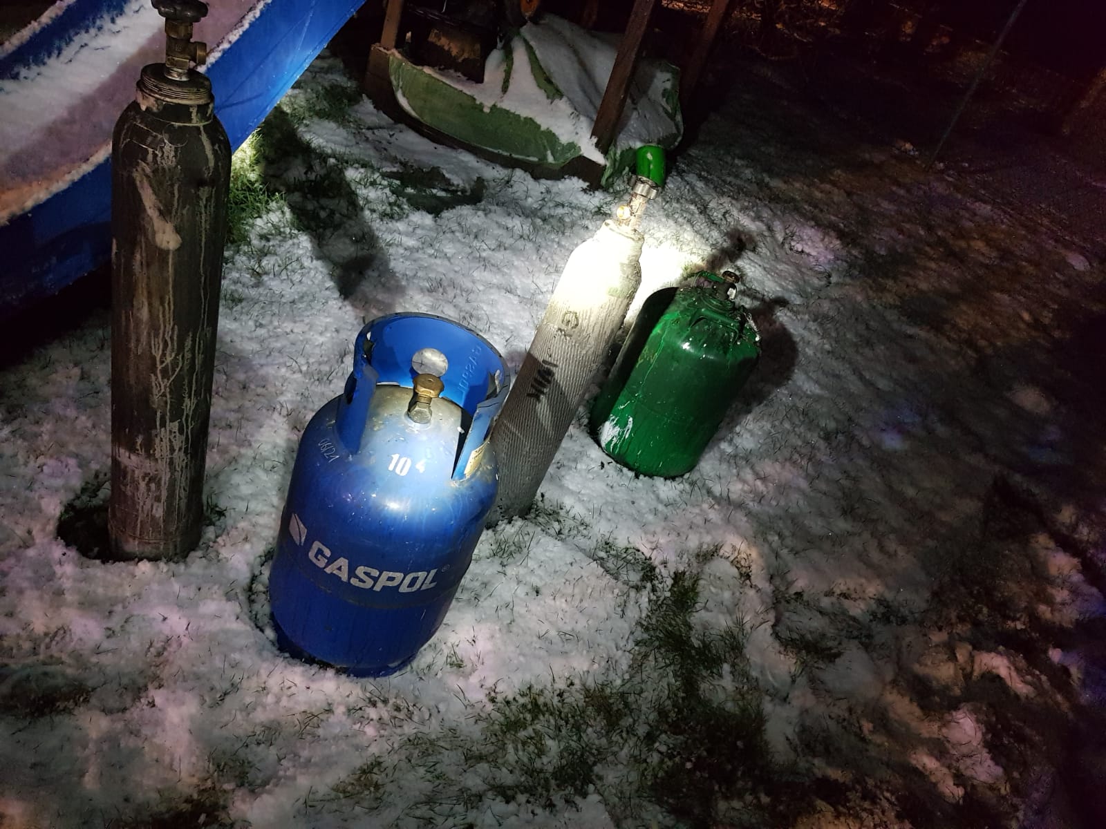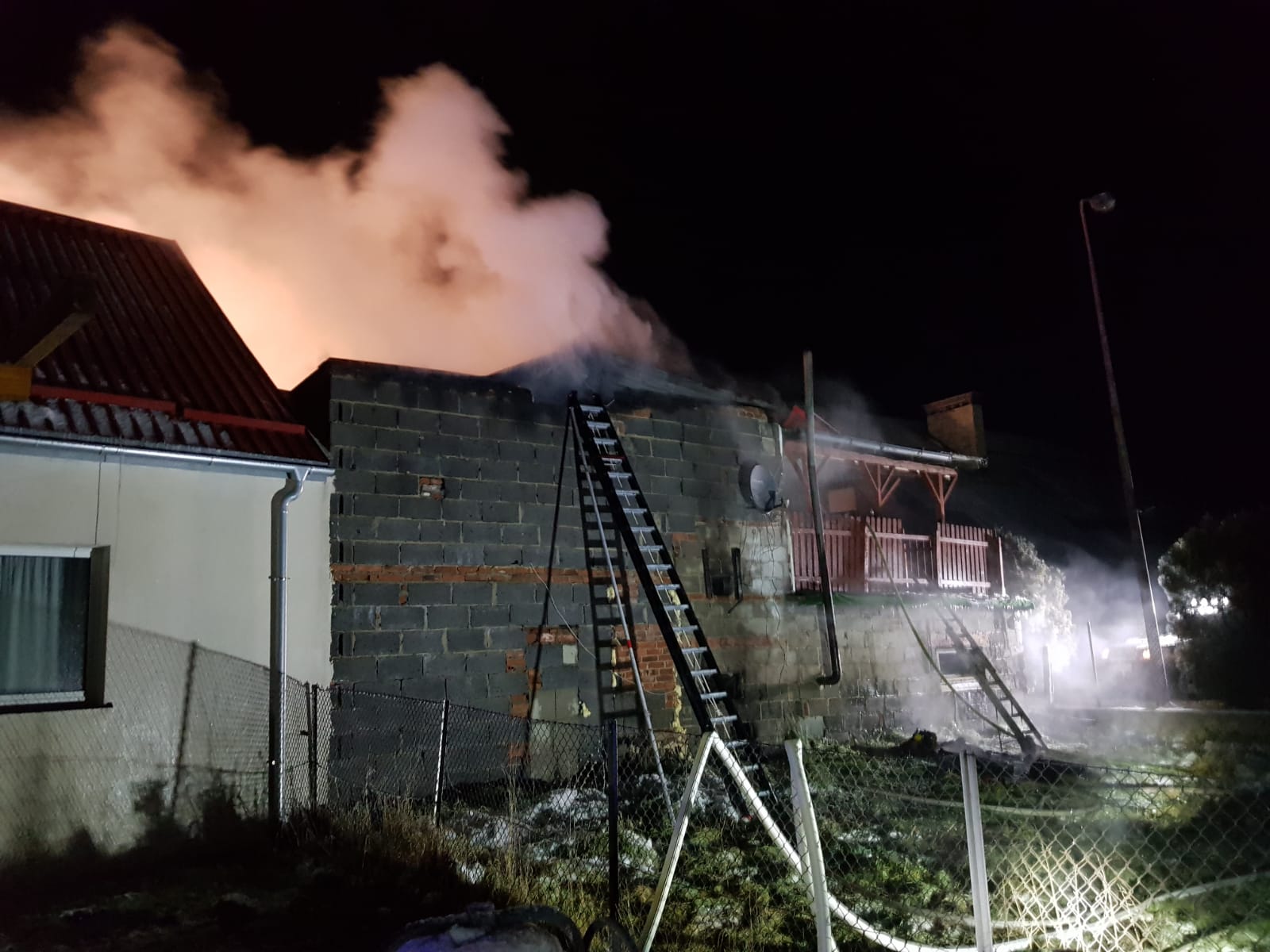 Działania strażaków w pierwszej fazie polegały na zabezpieczeniu i oświetleniu miejsca zdarzenia jednocześnie podano prądy gaśnicze w natarciu na pożar oraz obronie zabudowań znajdujących się w bezpośrednim sąsiedztwie. Mieszkańcy zagrożonego sąsiadującego budynku zostali ewakuowani w miejsce bezpieczne. Sukcesywnie z przybywaniem na miejsce kolejnych zastępów wprowadzano dodatkowe prądy gaśnicze z jednoczesnym przeszukaniem budynków objętych pożarem. W trakcie przeszukania natrafiono na butle z gazem propan-butan oraz gazami technicznymi, butle ewakuowano na zewnątrz budynku. Mieszkaniec który podjął próbę gaszenia pożaru, wymagał pomocy medycznej. W związku z powyższym strażacy udzielili mu kwalifikowanej pierwszej pomocy a przybyły na miejsce zdarzenia Zespół Ratownictwa Medycznego zadecydował o konieczności jego hospitalizacji. Po ugaszeniu pożaru budynki sprawdzono kamerą termowizyjną oraz czujnikiem wielogazowym w celu potwierdzenia usunięcia zagrożenia.