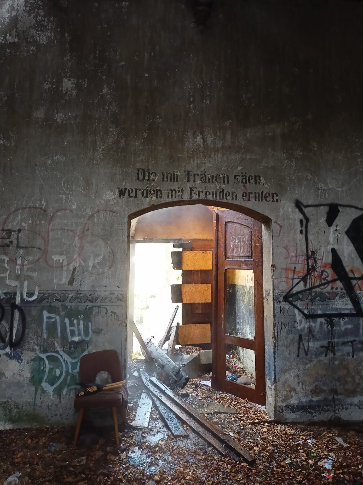 Po przybyciu na miejsce zdarzenia stwierdzono pożar w budynku nieczynnej kaplicy znajdującej się na cmentarzu ewangelickim. Pożarem objęta była częściowo konstrukcja dachu i drzwi wejściowe.