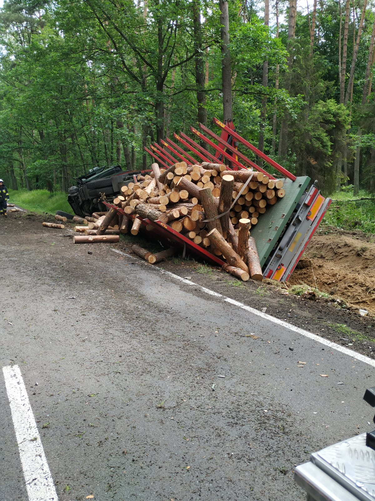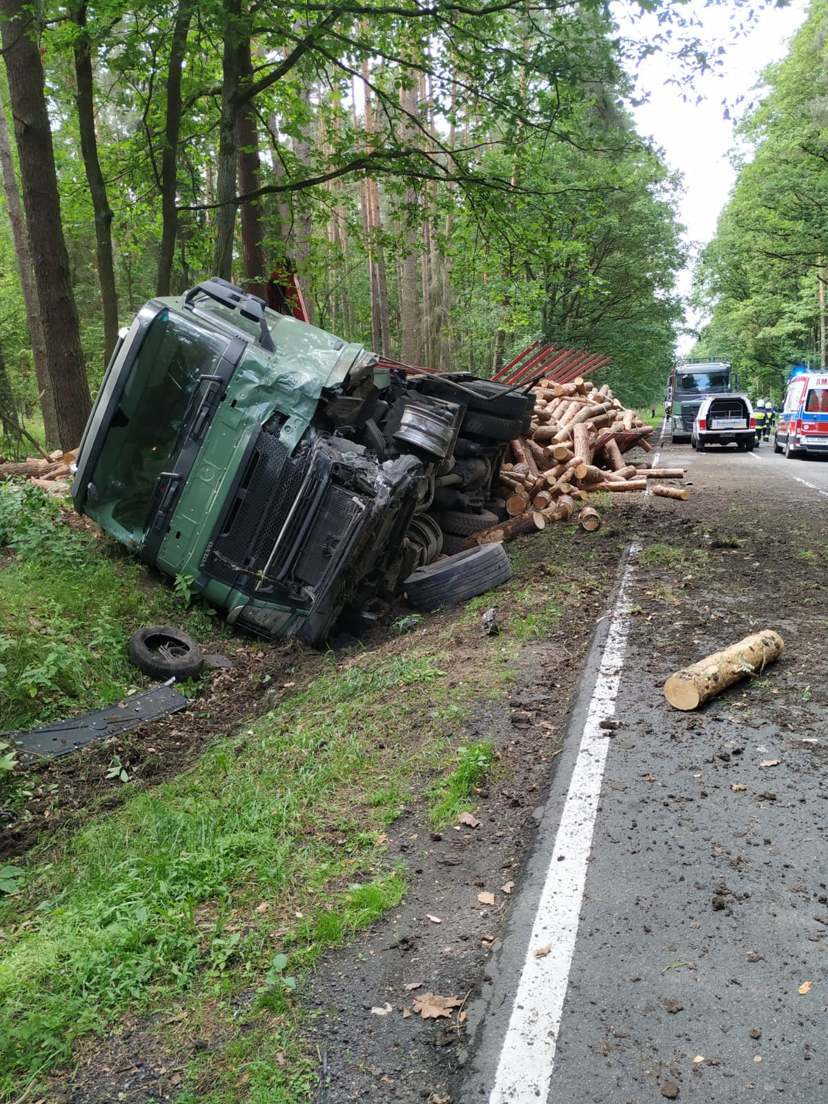 Po dotarciu na miejsce zdarzenia stwierdzono, że doszło do zderzenia samochodu osobowego z ciągnikiem siodłowym z naczepą przewożącym drewno. Pojazdami podróżowali jedynie kierowcy.