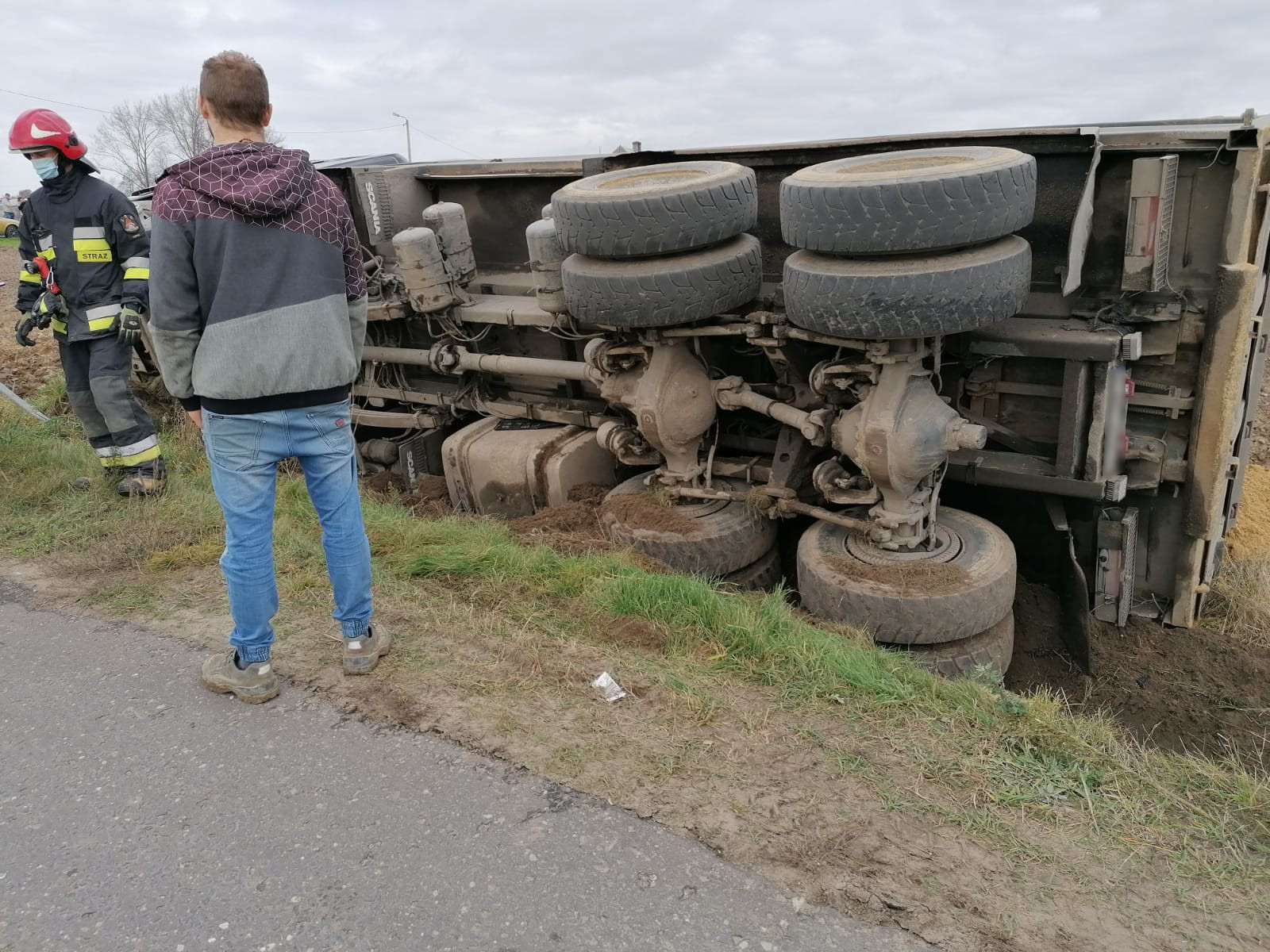 17.11.2020 - Samochód ciężarowy wypadł z drogi i przewrócił się na bok.