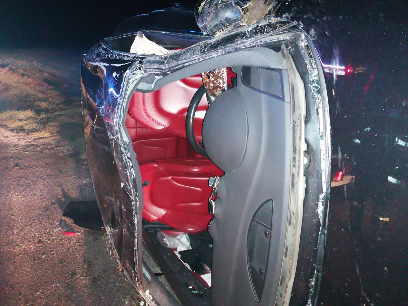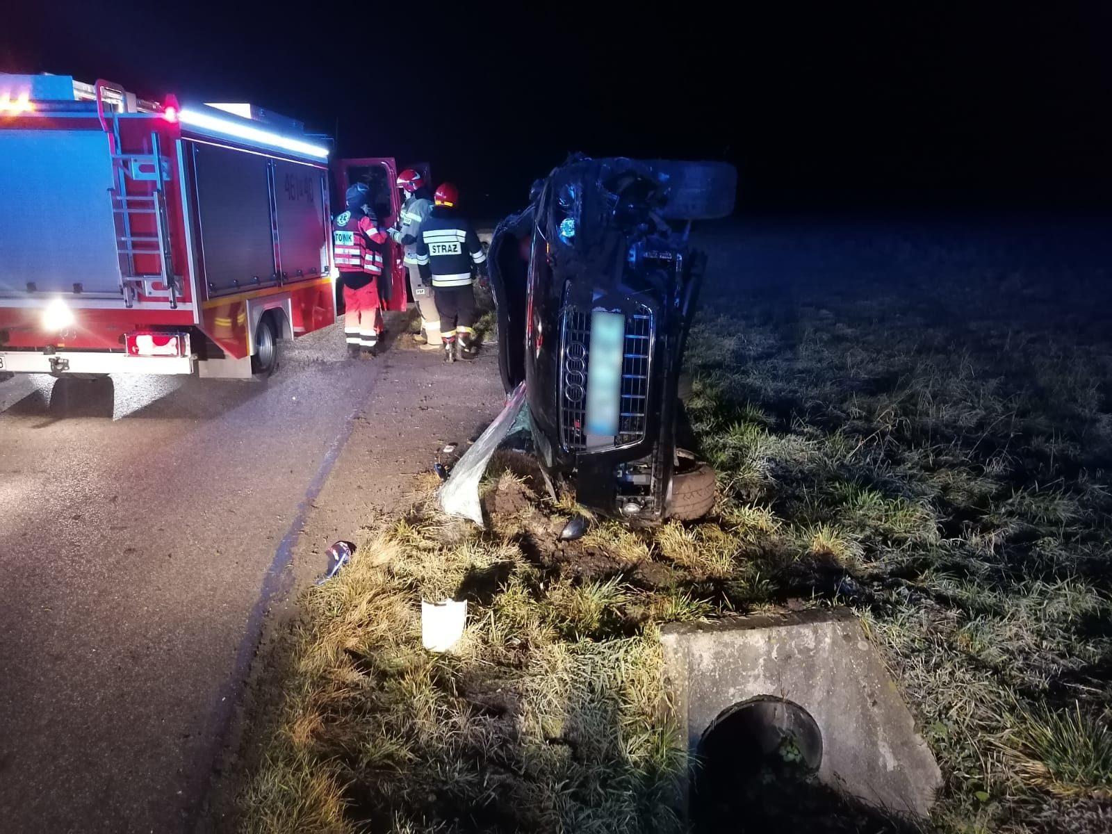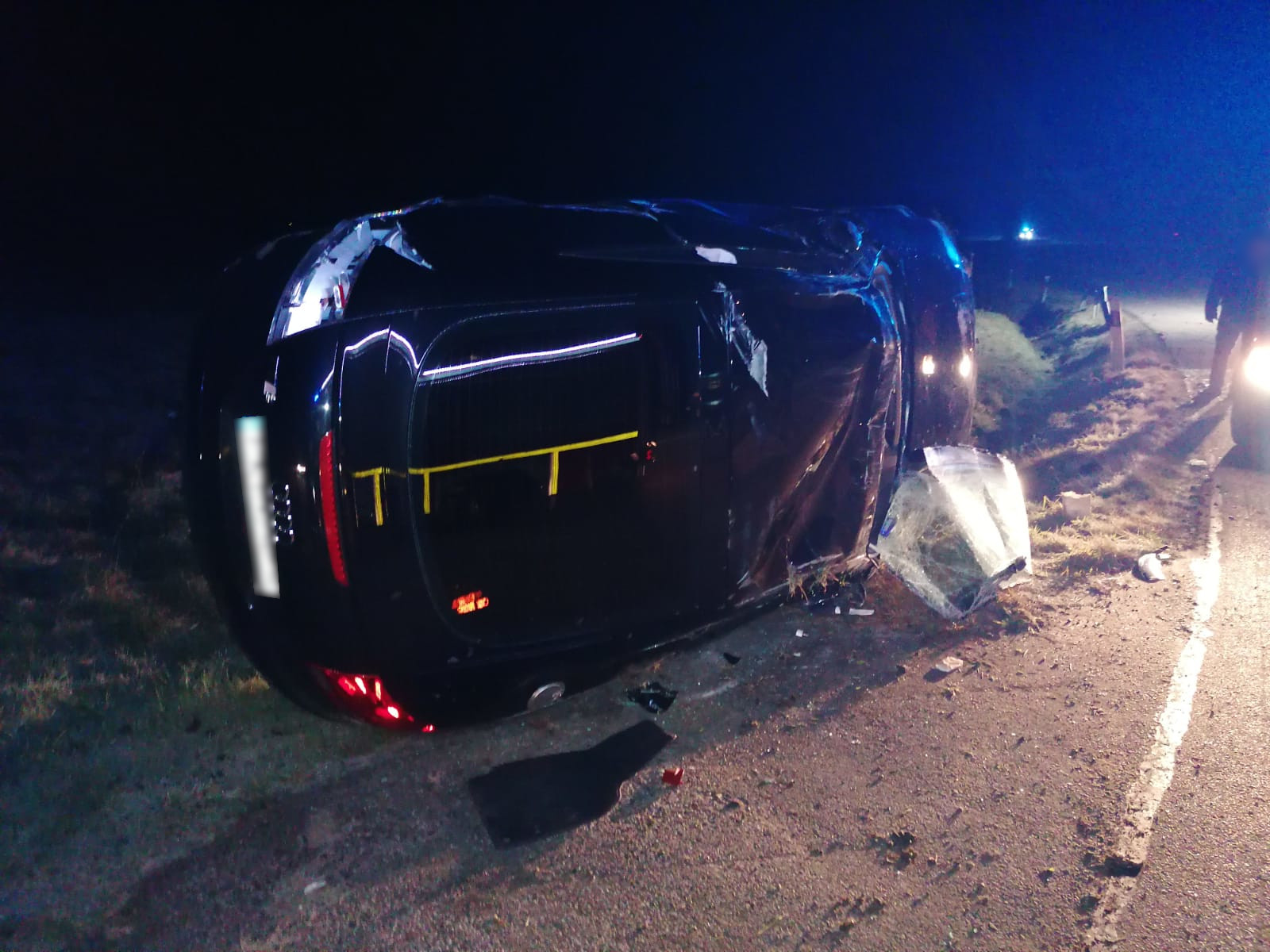 Po przybyciu na miejsce zdarzenia zastano samochód osobowy leżący na boku. Osoba nim podróżująca (kobieta 35 lat) opuściła go o własnych siłach przed przybyciem na miejsce służb ratunkowych.
