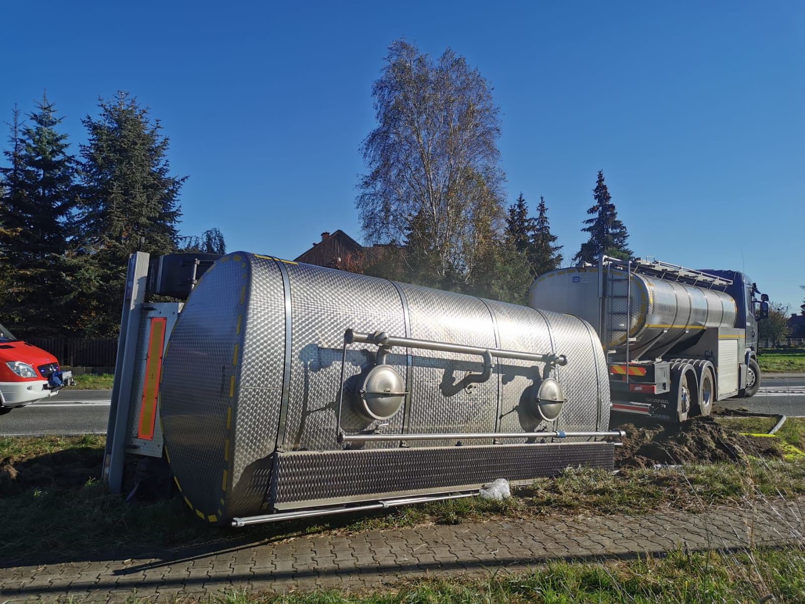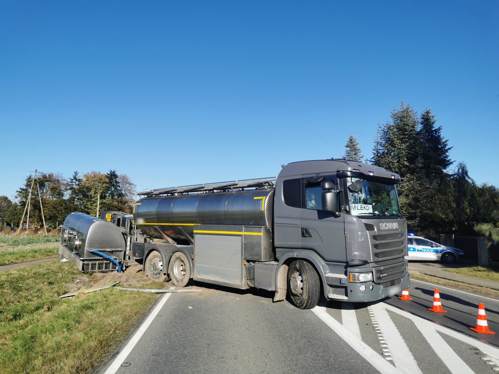 20.10.2022 - Zestaw pojazdów przewożący mleko wypadł z drogi