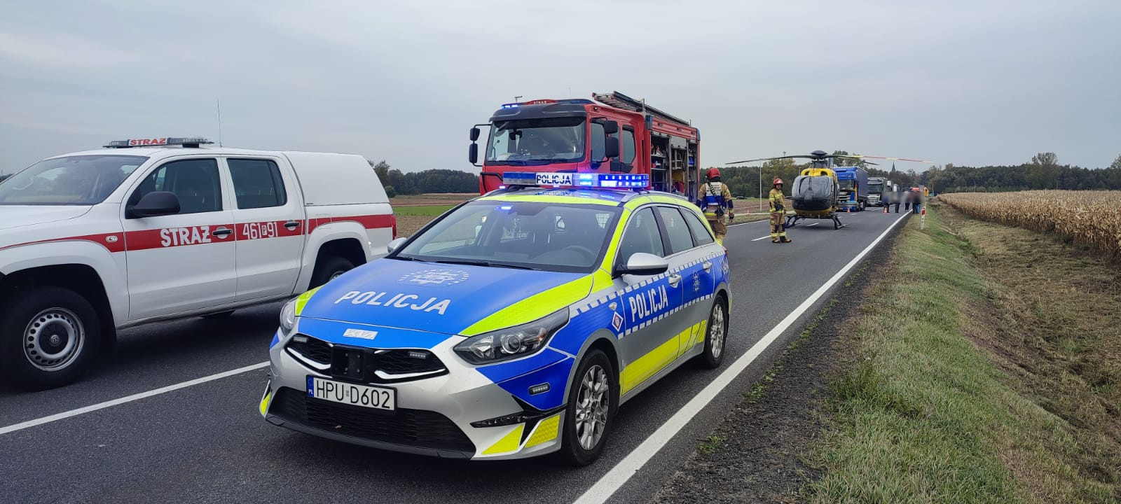 Po przybyciu zespołu ratownictwa medycznego kontynuowano działania medyczne, a po ewakuacji z pojazdu poszkodowany został przetransportowany śmigłowcem Lotniczego Pogotowia Ratunkowego do szpitala.