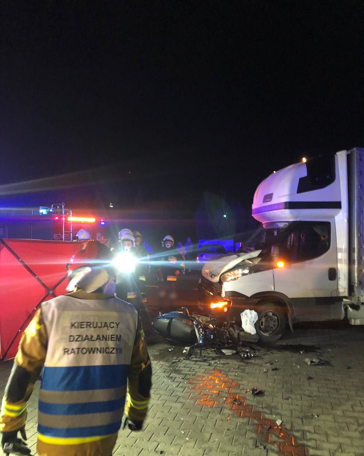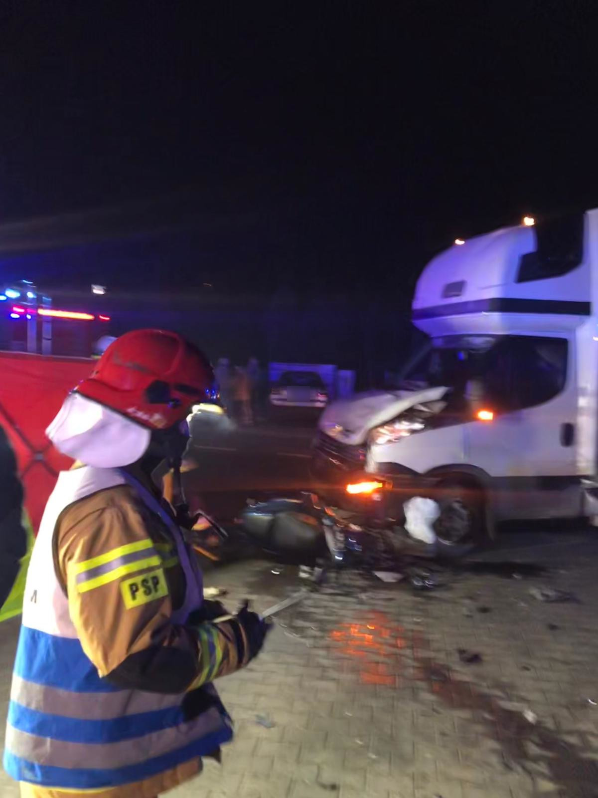We wtorek 23.02.2021 r około godziny 19:15 Dyżurny SKKP w Kępnie otrzymał zgłoszenie o wypadku z udziałem samochodu dostawczego i motoroweru na 456 km drogi krajowej nr 11 w miejscowości Piaski. Do zdarzenia zadysponowano zastępy z OSP Łęka Opatowska, OSP Piaski oraz JRG Kępno.