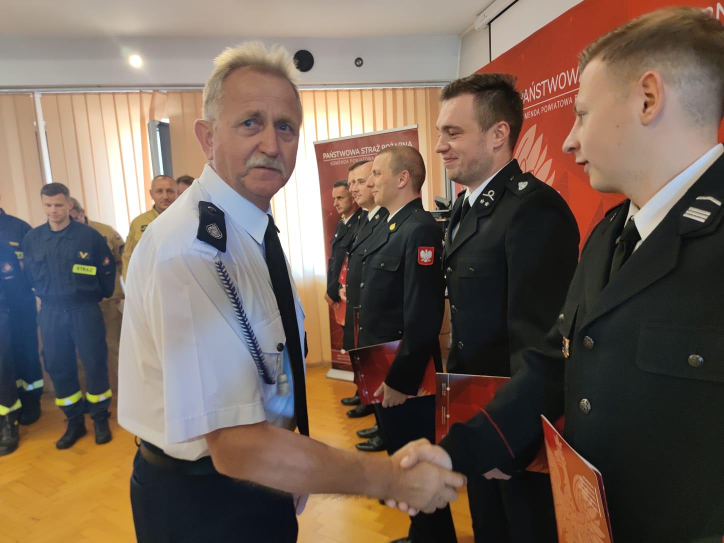 Najprzyjemnięszą częścią piątkowego wydarzenia było uścinięcie dłoni dha Karola Trąbczyńskiego, który przez wiele lat zaangażowany jest w współtworzenie ochrony przeciwpożarowej na terenie naszego powiatu czynnie uczestnicząc w działaniach ratowniczo-gaśniczych. Wspomnianego dnia to on wymagał pomocy, która została mu skutecznie udzielona.
