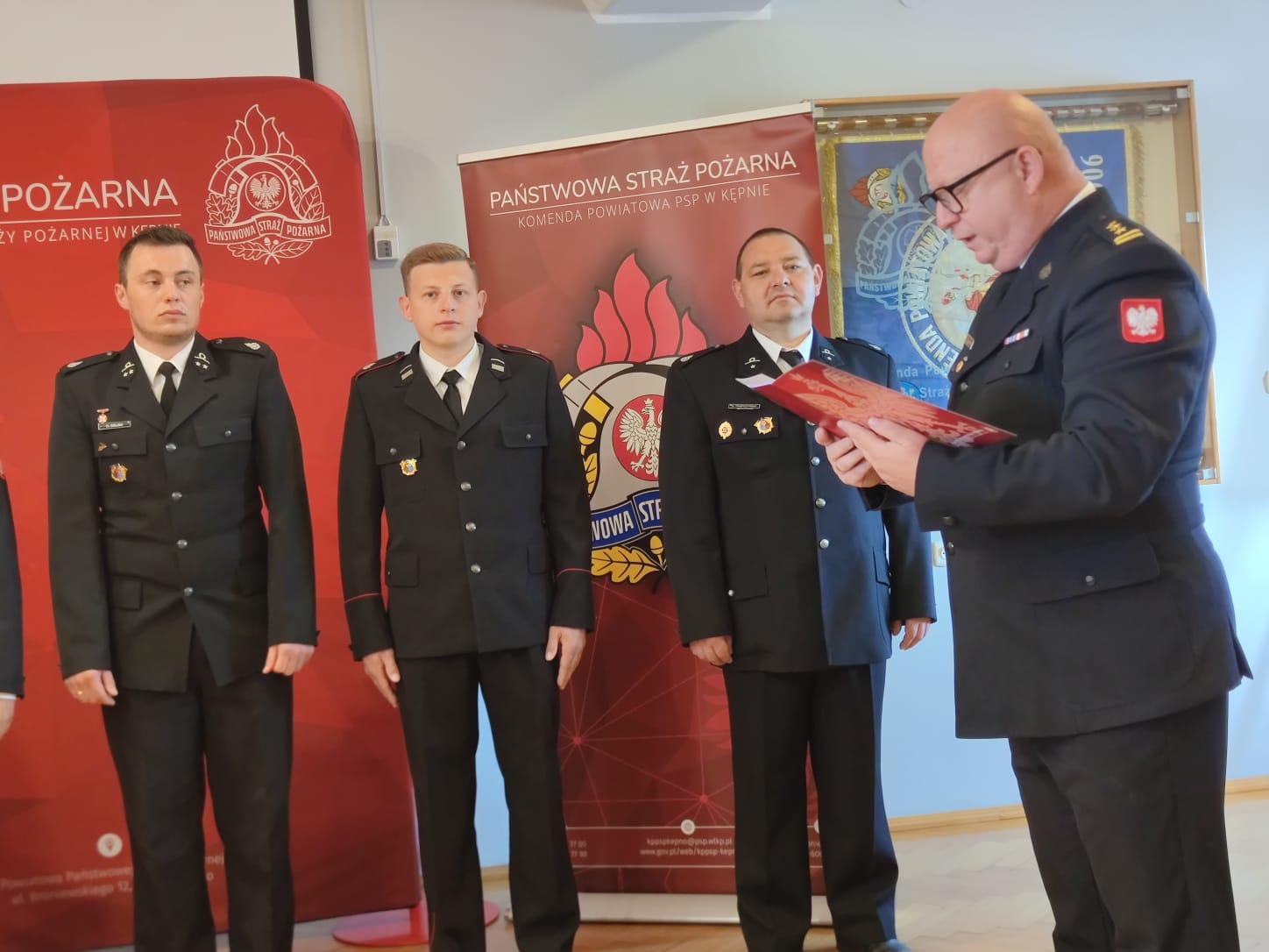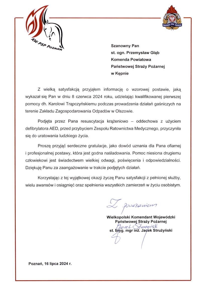 W piątek 26.07.br w siedzibie Komendy Powiatowej Państwowej Straży Pożarnej w Kępnie wręczono listy gratulacyjne Wielkopolskiego Komendanta Wojewódzkiego Państwowej Straży Pożarnej za udzielenie kwalifikowanej pierwszej pomocy strażakowi poszkodowanemu podczas działał gaśniczych na terenie Zakładu Zagospodarowania Odpadów w Olszowie.