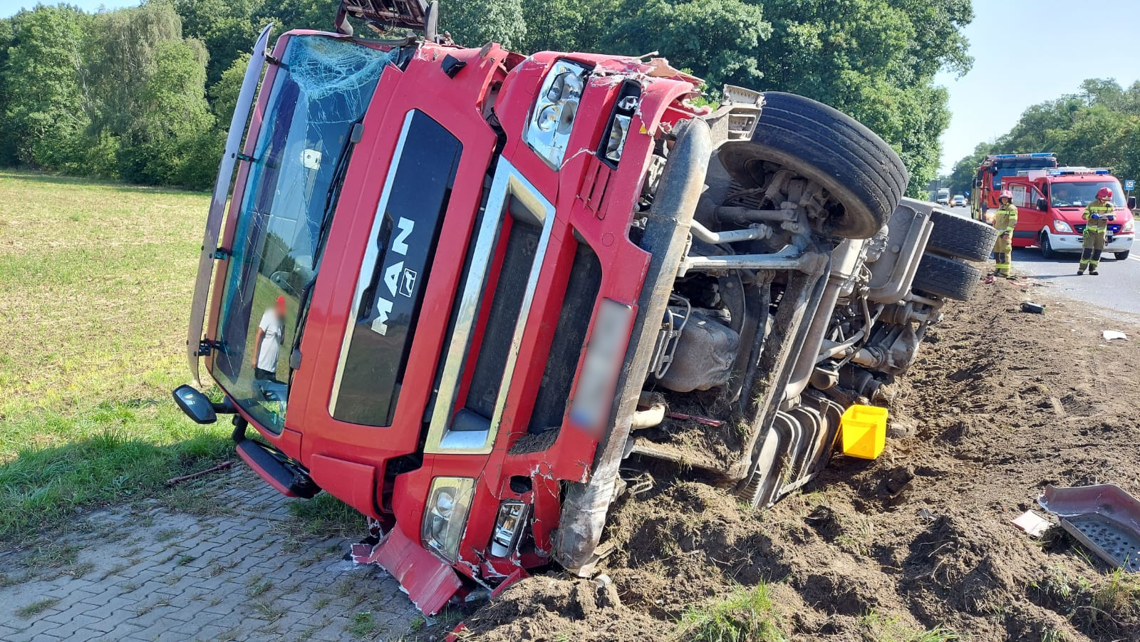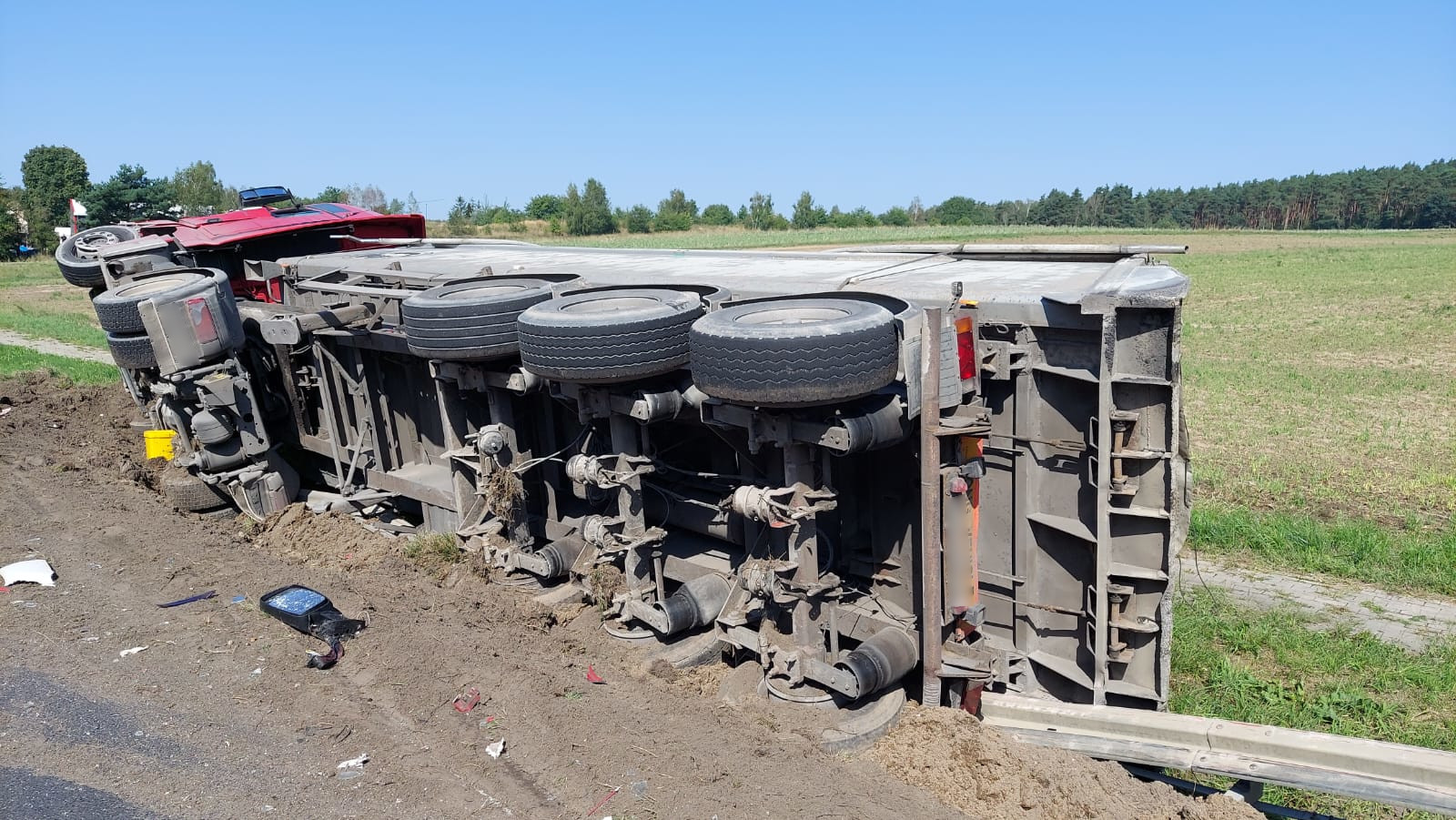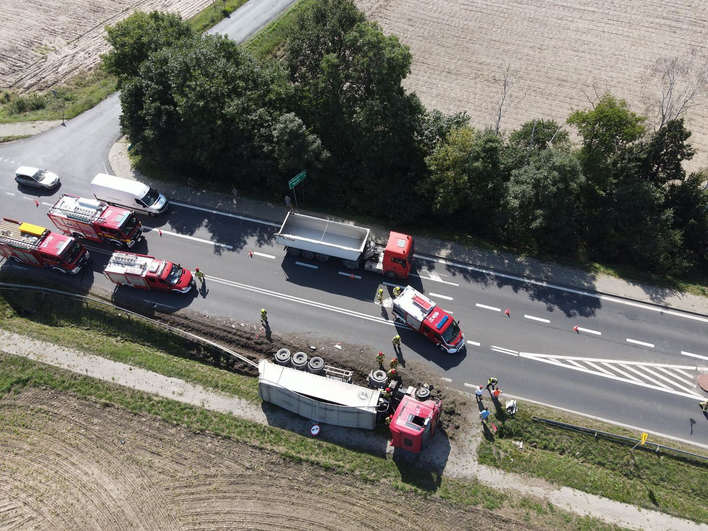 Po dotarciu na miejsce zdarzenia stwierdzono, że doszło do kolizji dwóch ciągników siodłowych z naczepami w wyniku której jeden z nich wjechał do rowu i przewrócił się na bok. Kierowcy pojazdów nie wymagali pomocy medycznej. Na potrzeby działań zablokowano jeden pas ruchu.
