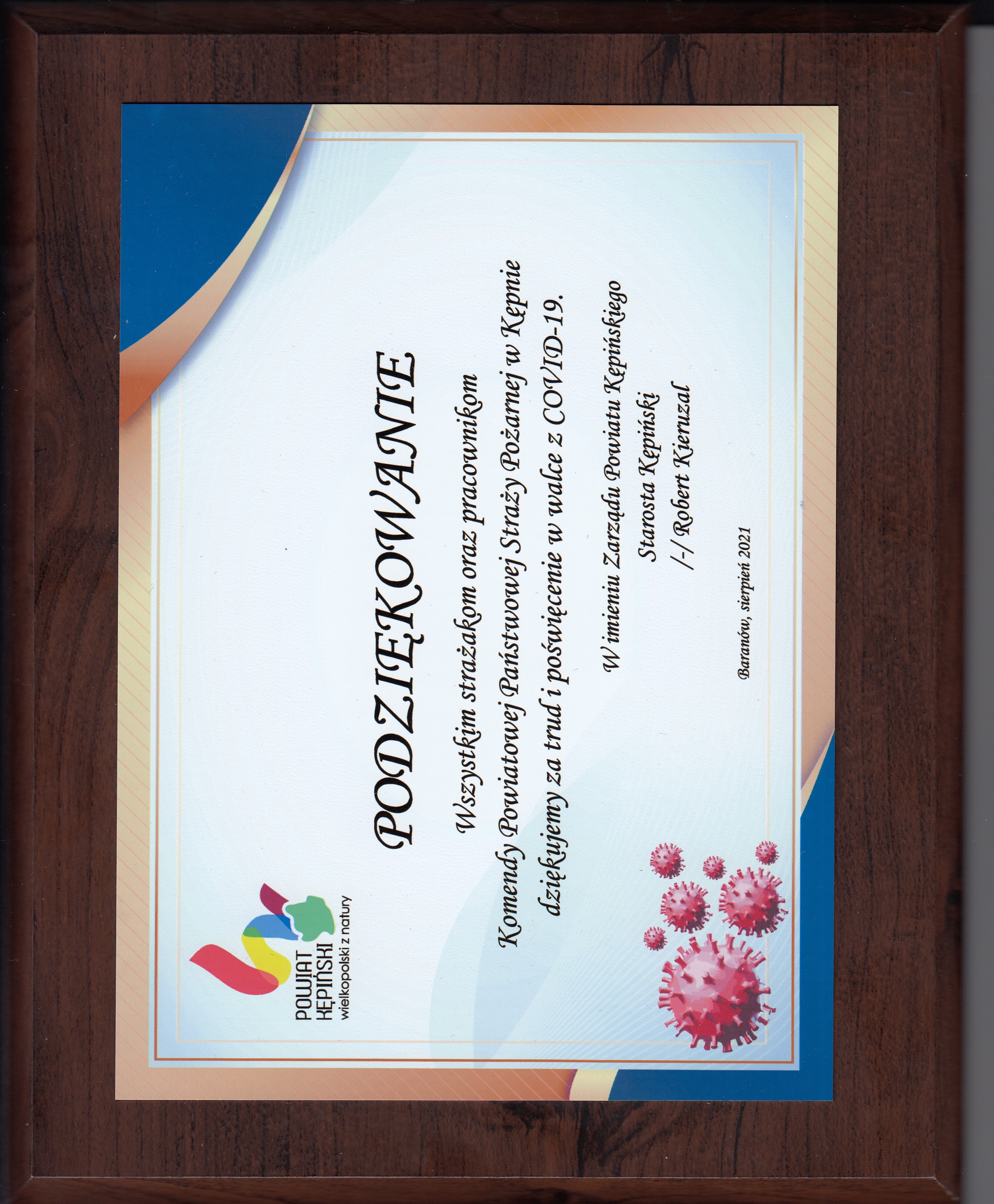 W trakcie wydarzenia przedstawiciele Zarządu Powiatu Kępińskiego wręczyli podziękowania dla służb i podmiotów zaangażowanych w walkę z COVID-19, wśród których znalazła się również Komenda Powiatowa Państwowej Straży Pożarnej. Podziękowania z rąk Starosty Kępińskiego Roberta Kieruzala oraz Wicestarosty Kępińskiego Alicji Śniegockiej otrzymał Zastępca Komendanta Powiatowego Państwowej Straży Pożarnej w Kępnie st. kpt. Jarosław Kucharzak.