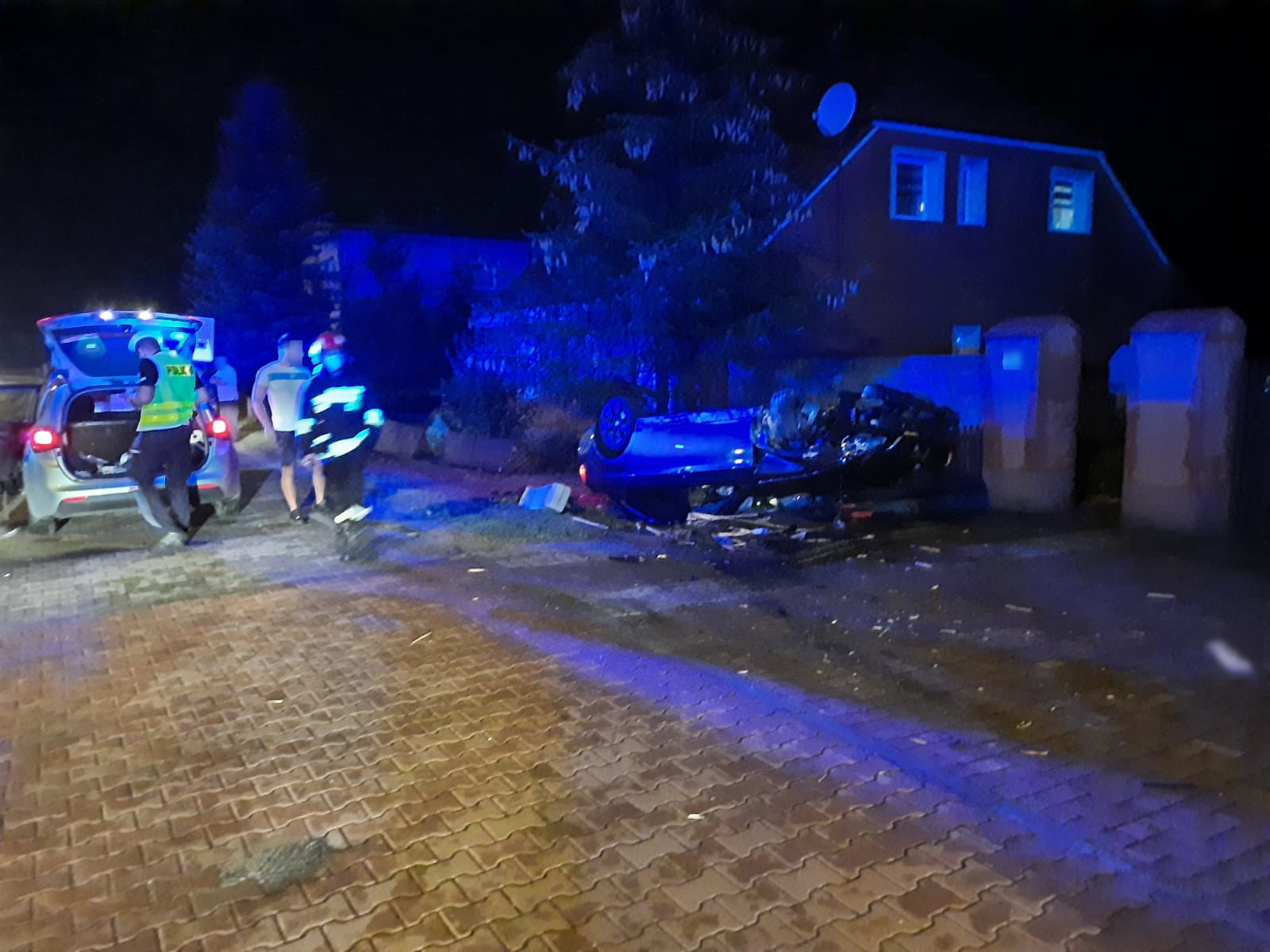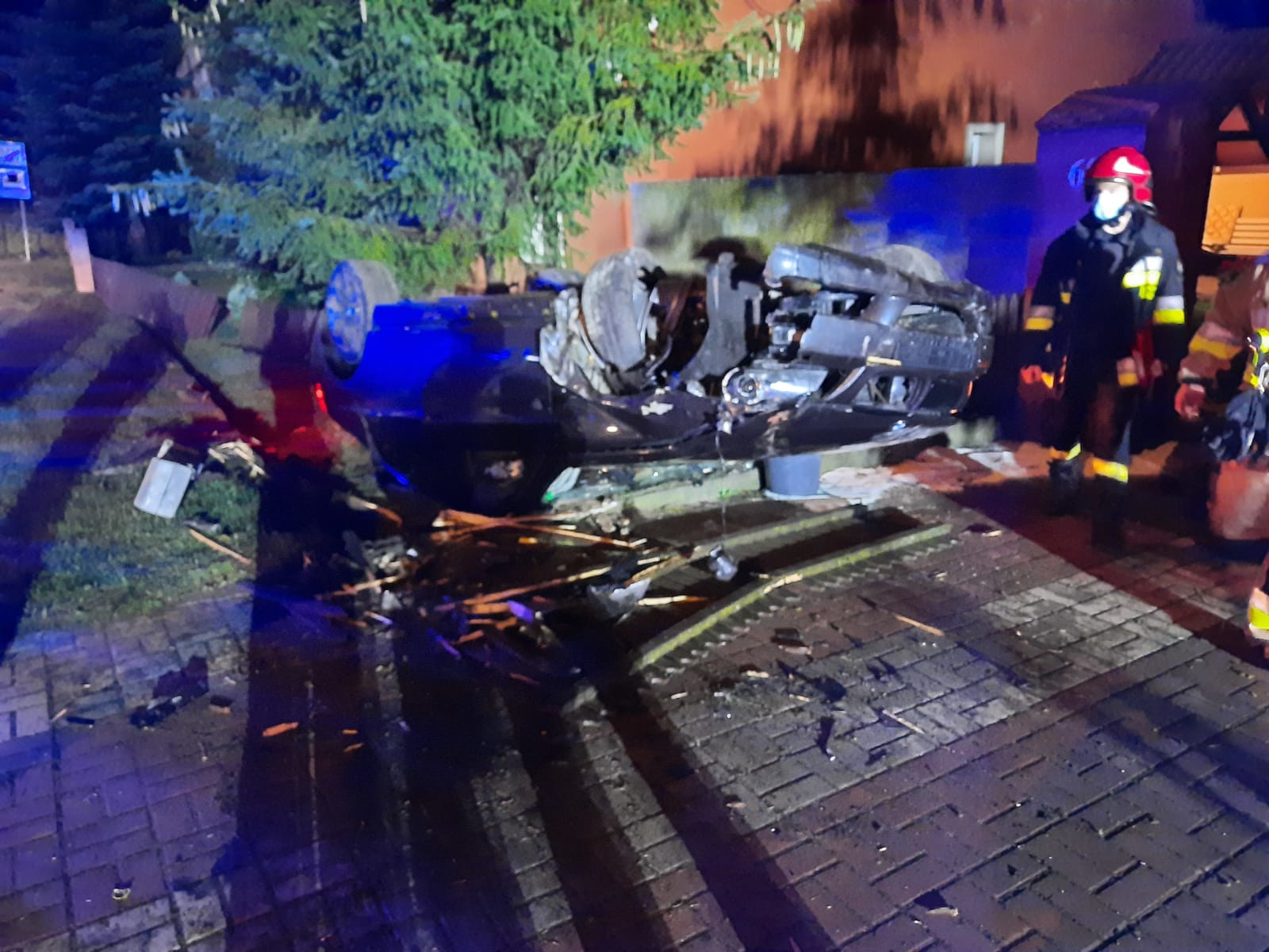 Po przybyciu na miejsce zdarzenia pierwszych zastępów stwierdzono, że doszło do dachowania samochodu osobowego który wypadł z jezdni uderzając w ogrodzenie posesji na ul. Wrocławskiej. Pojazdem podróżowało 2 osoby, które były pod opieką Zespołu Pogotowia Ratunkowego przybyłego na miejsce zdarzenia przed jednostkami ochrony przeciwpożarowej.