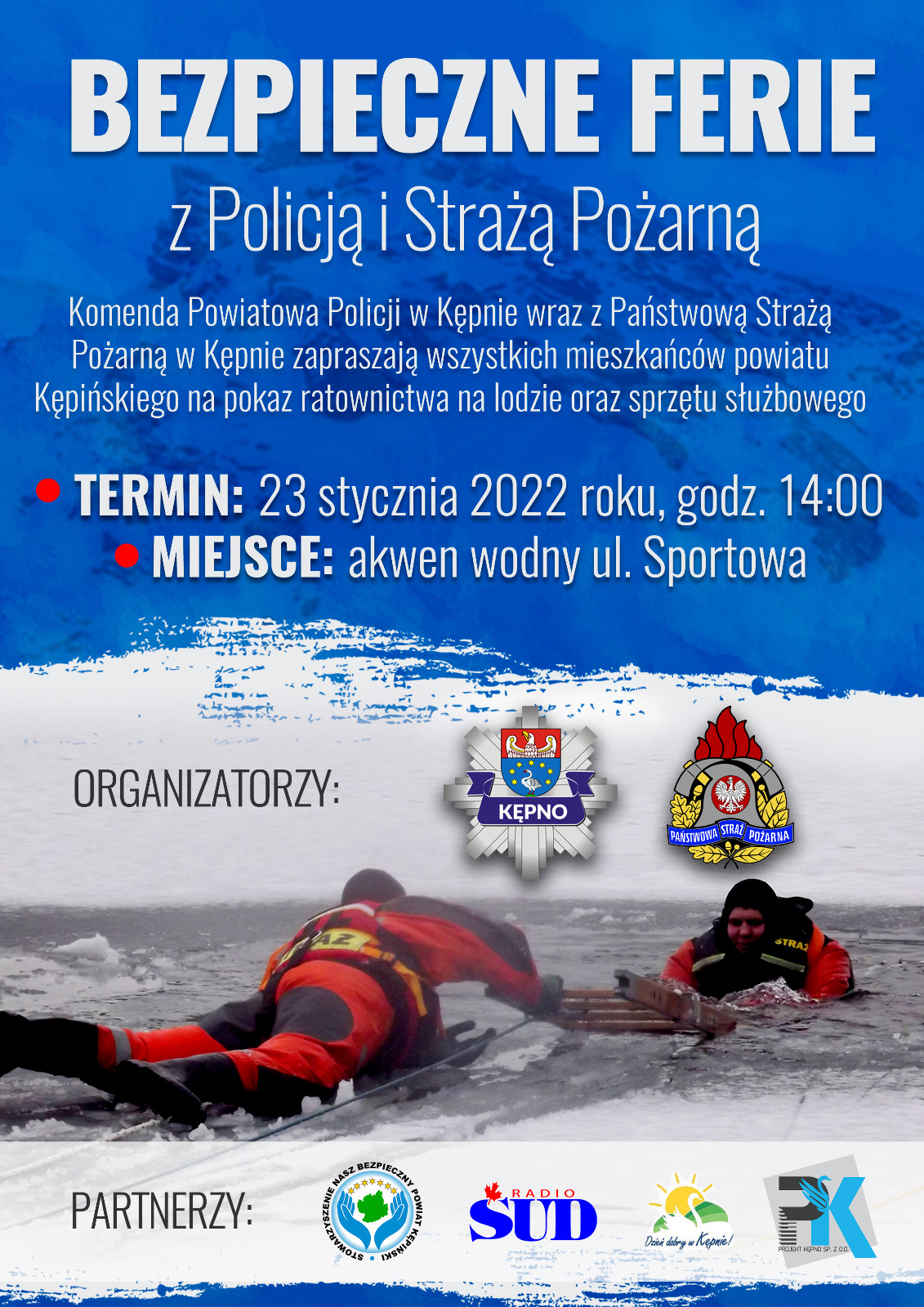 Komenda Powiatowa Policji w Kępnie wraz z Komenda Powiatową Państwowej Straży Pożarnej w Kępnie zapraszają wszystkich mieszkańców powiatu kępińskiego na pokaz ratownictwa na lodzie oraz sprzętu służbowego, który odbędzie się w niedzielę 23.01.2022 r. o godz. 14:00 na akwenie wodnym przy u. Sportowej 9 w Kępnie.