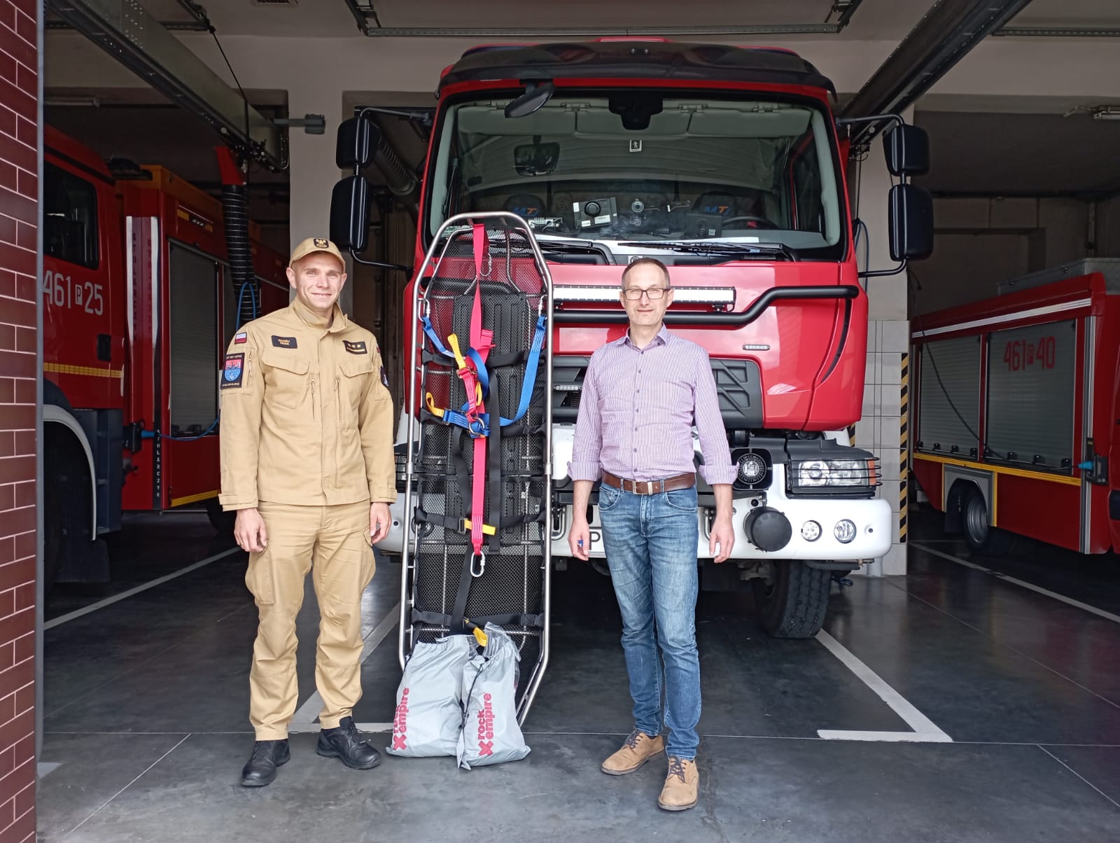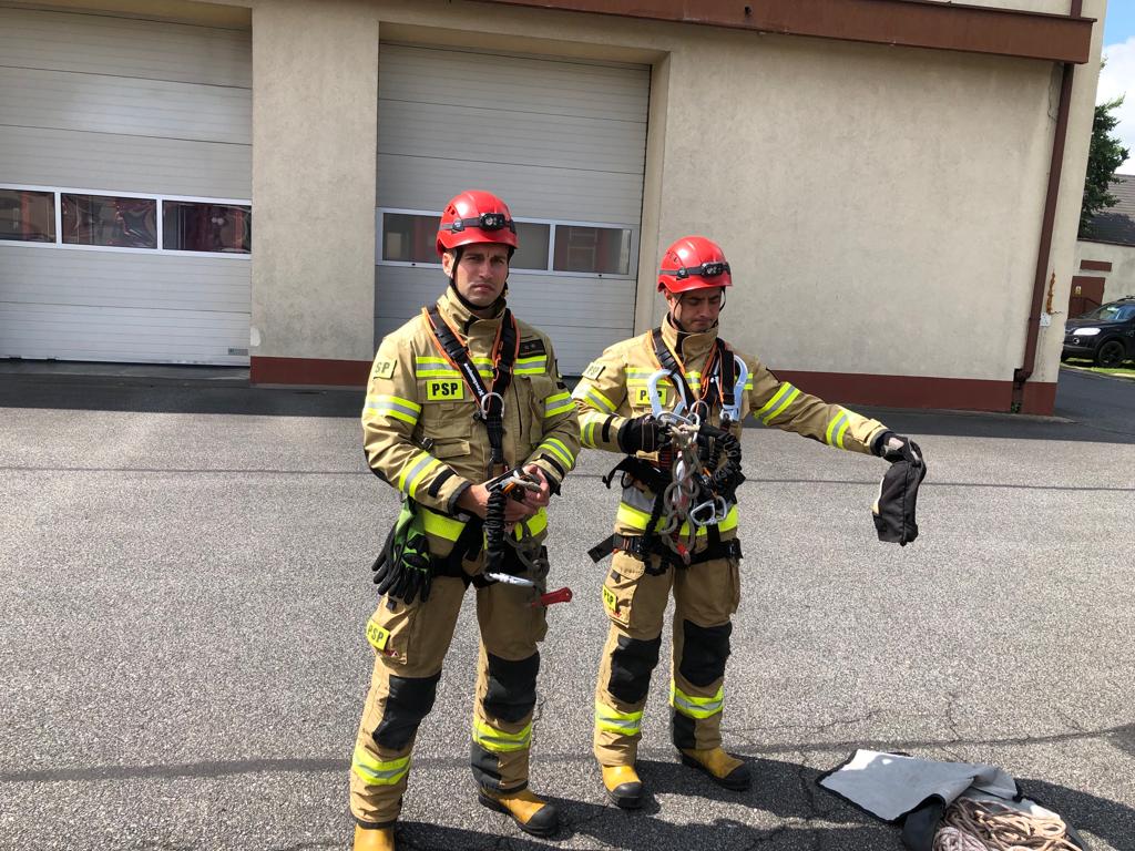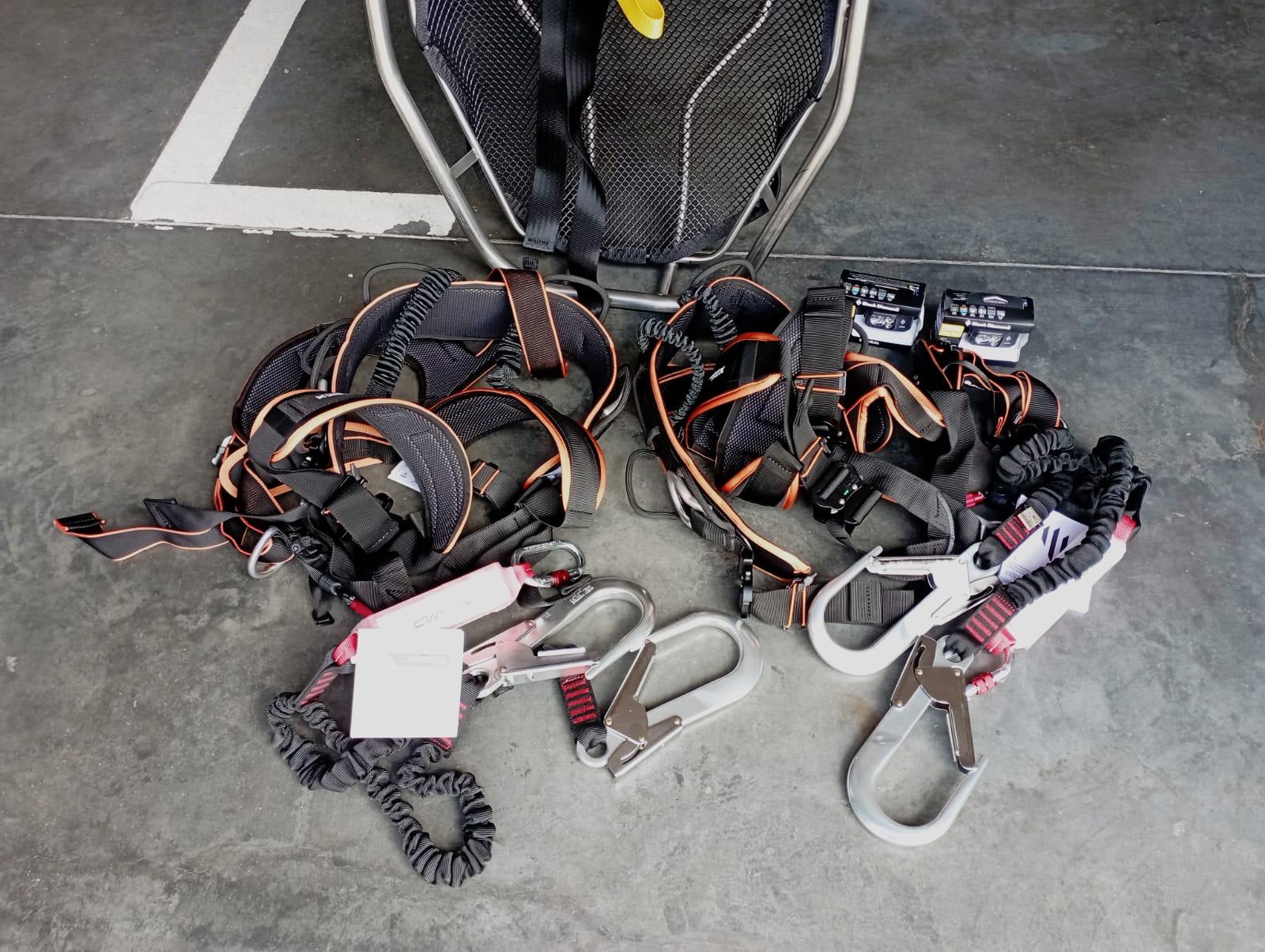 • 2 komplety lonży asekuracyjnych z karabinkami o dużym prześwicie Camp Y Shock Absorber przeznaczonych do asekuracji ratowników poruszających się po drabinach oraz konstrukcjach kratownicowych,