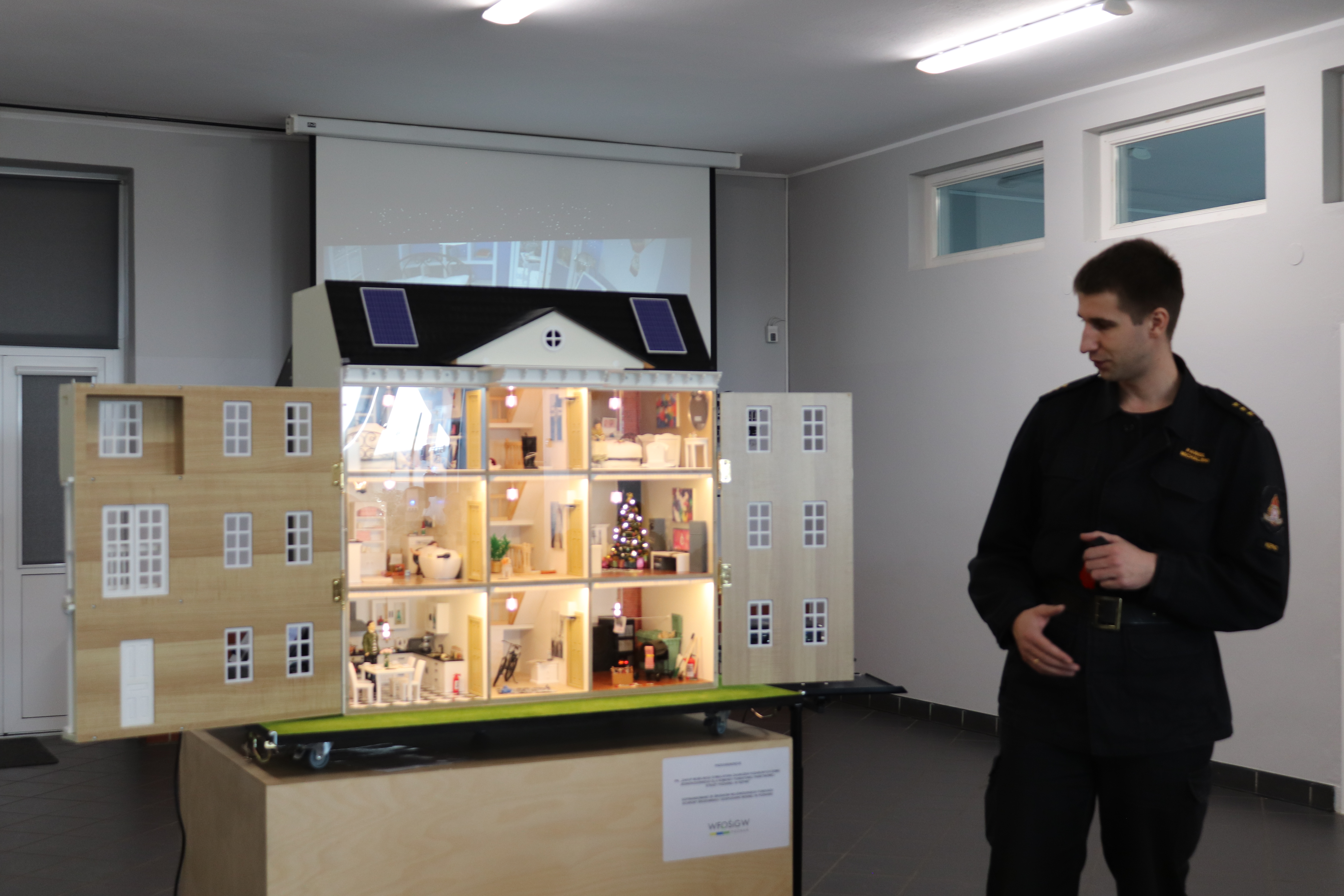Podczas pokazu zwizualizowano zagrożenia z zakresu bezpieczeńśtwa pożarowego występujące w budynkach mieszkalnych. Dzieci biorące udział w spotkaniu wykazały się dużą wiedzą i świadomością zagrożeń pożarowych.