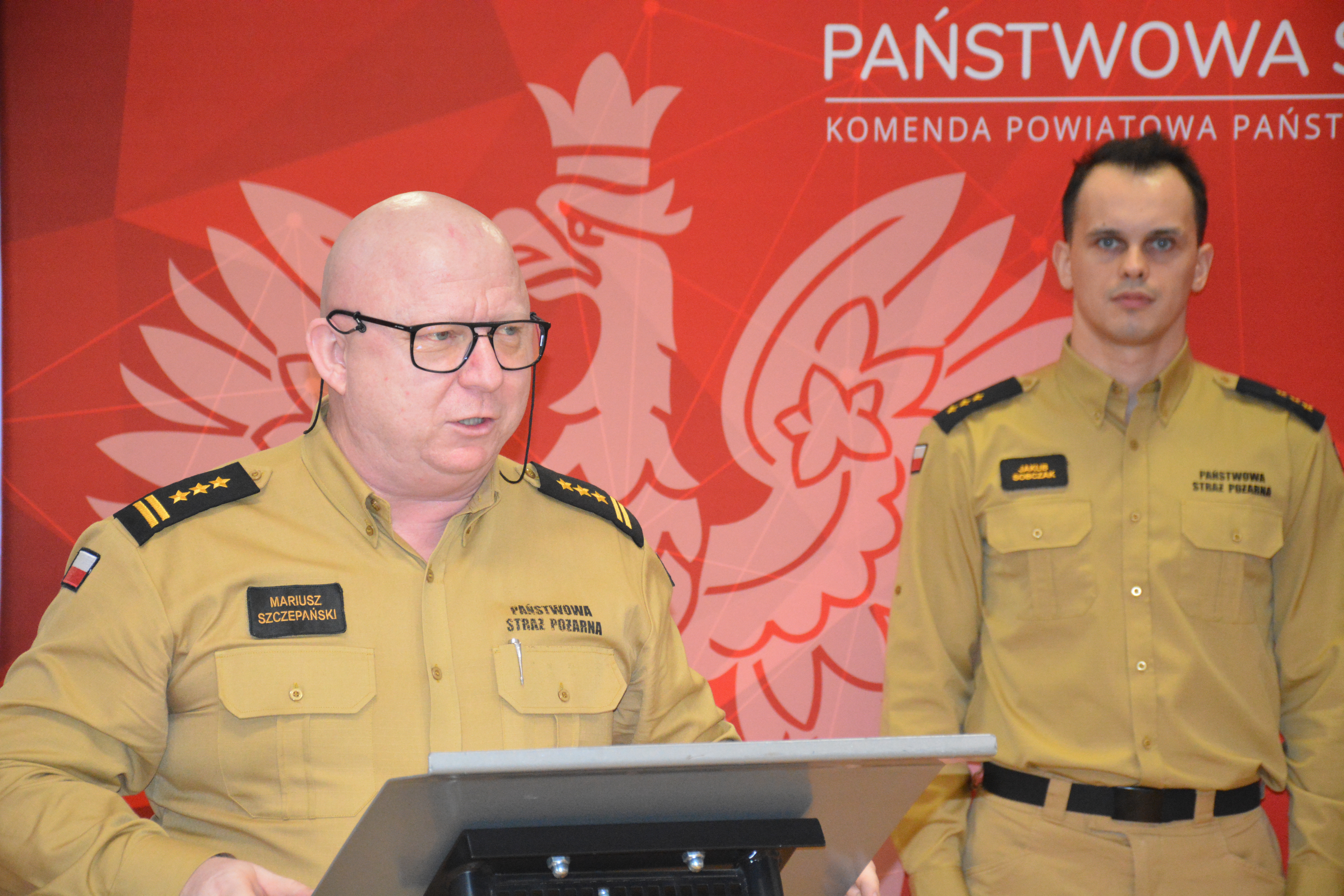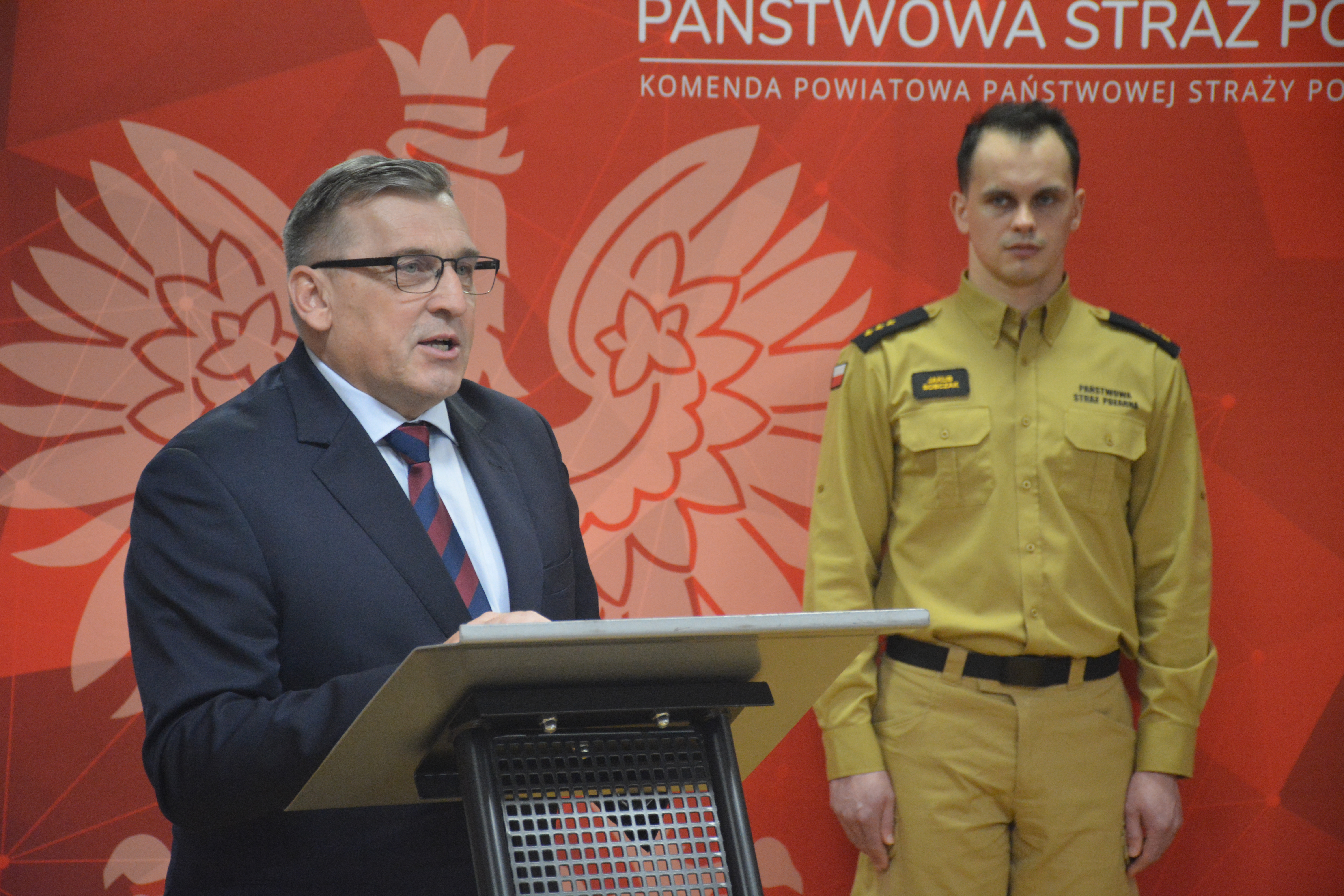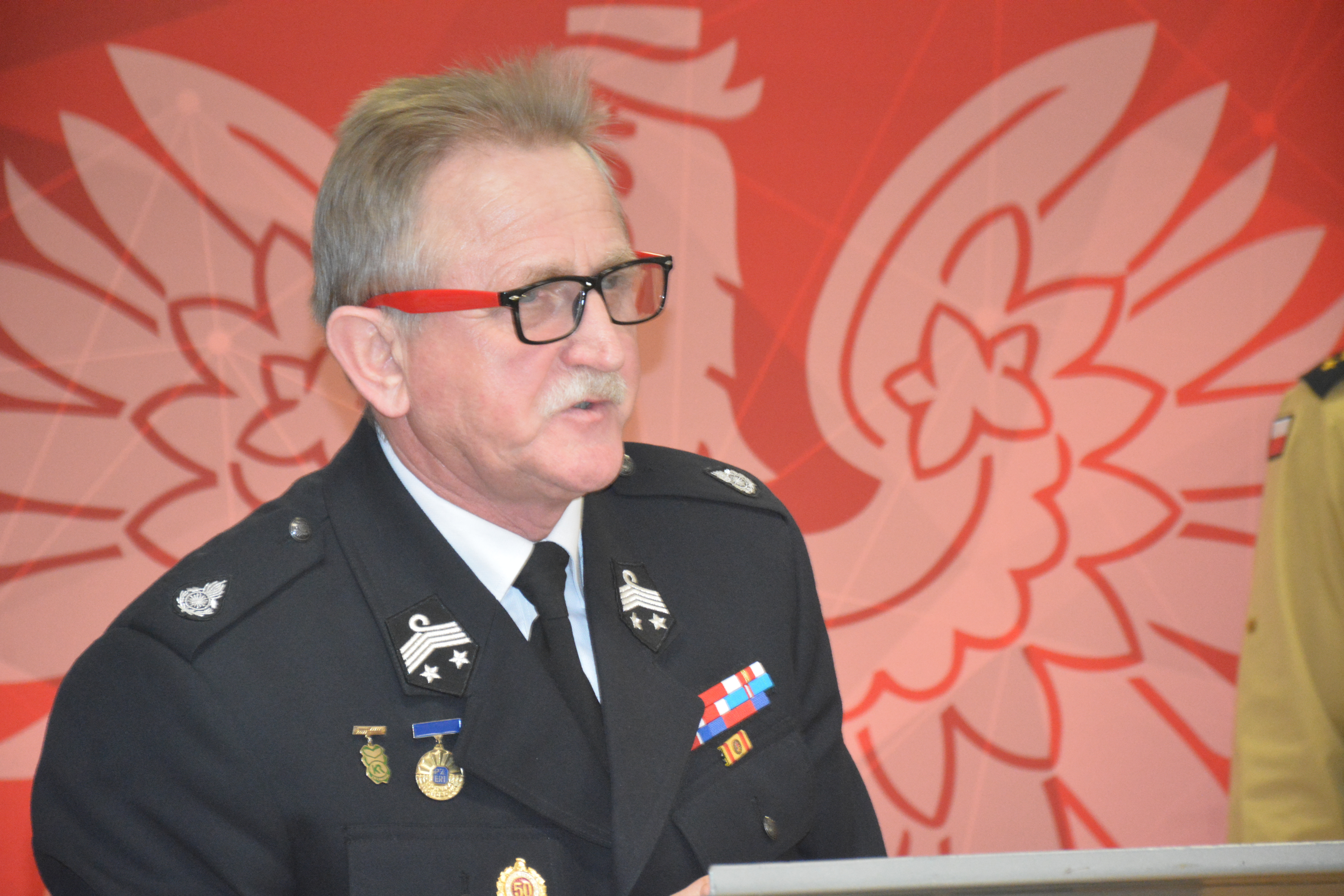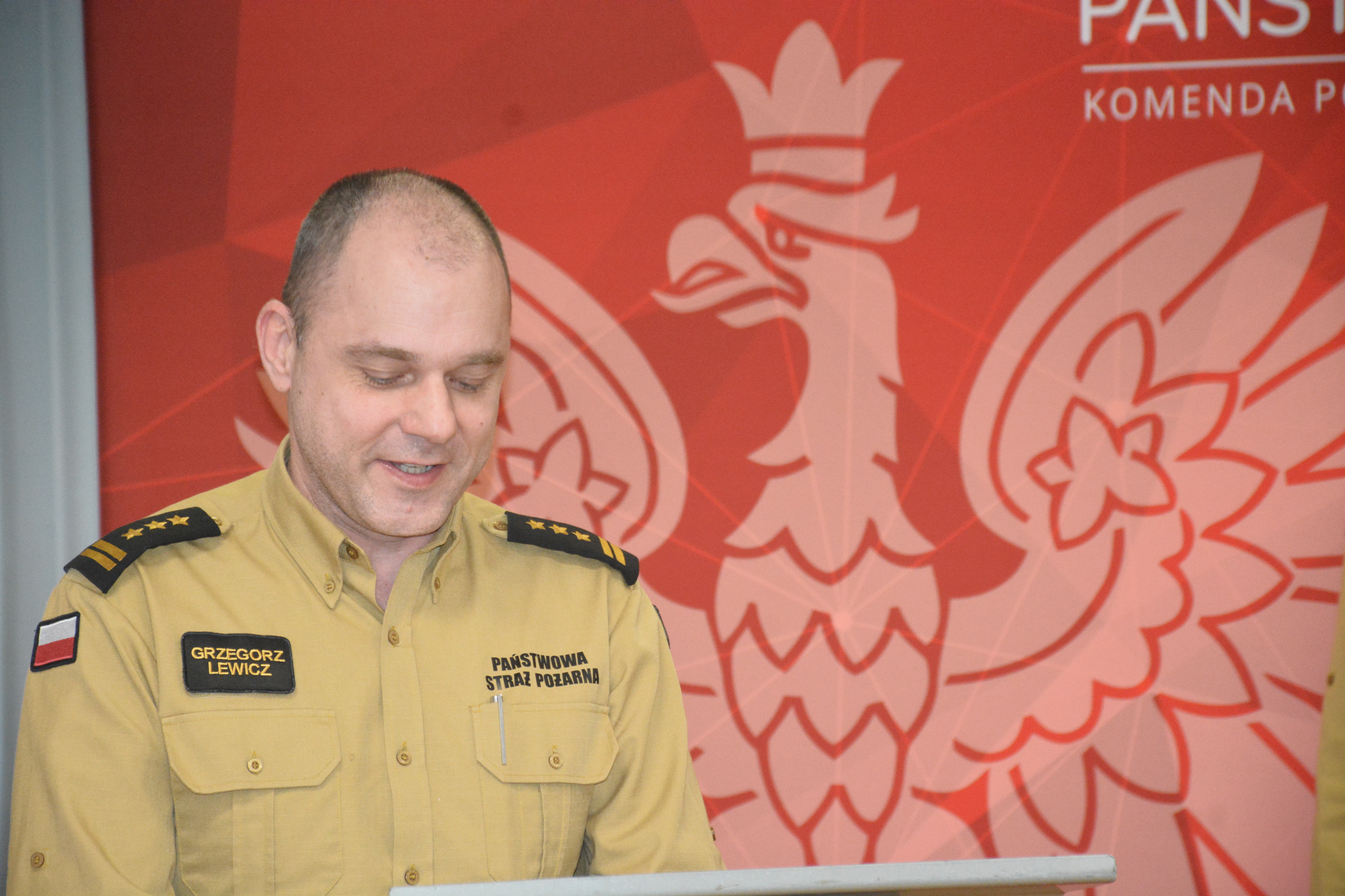 st. bryg. Grzegorz Lewicz w imieniu Wielkopolskiego Komendanta Wojewódzkiego PSP podziękował za zrealizowane zadania przez tut. Komendę oraz przedstawił statystykę działań za miniony rok z poziomu województwa wielkopolskiego. Podczas przemówienia podkreślił rolę wielkopolskich strażaków w niesieniu pomocy, w kontekście anomalii pogodowych, które wystąpiły w południowo-zachodniej części kraju w 2024 r. Zwrócił również uwagę na potrzebę inwestowania we własne bezpieczeństwo poprzez instalowanie czujników dymu oraz czadu w budynkach mieszkalnych, jak również podkreślił wagę podejmowanych działań w zakresie edukacji pożarowej społeczeństwa.