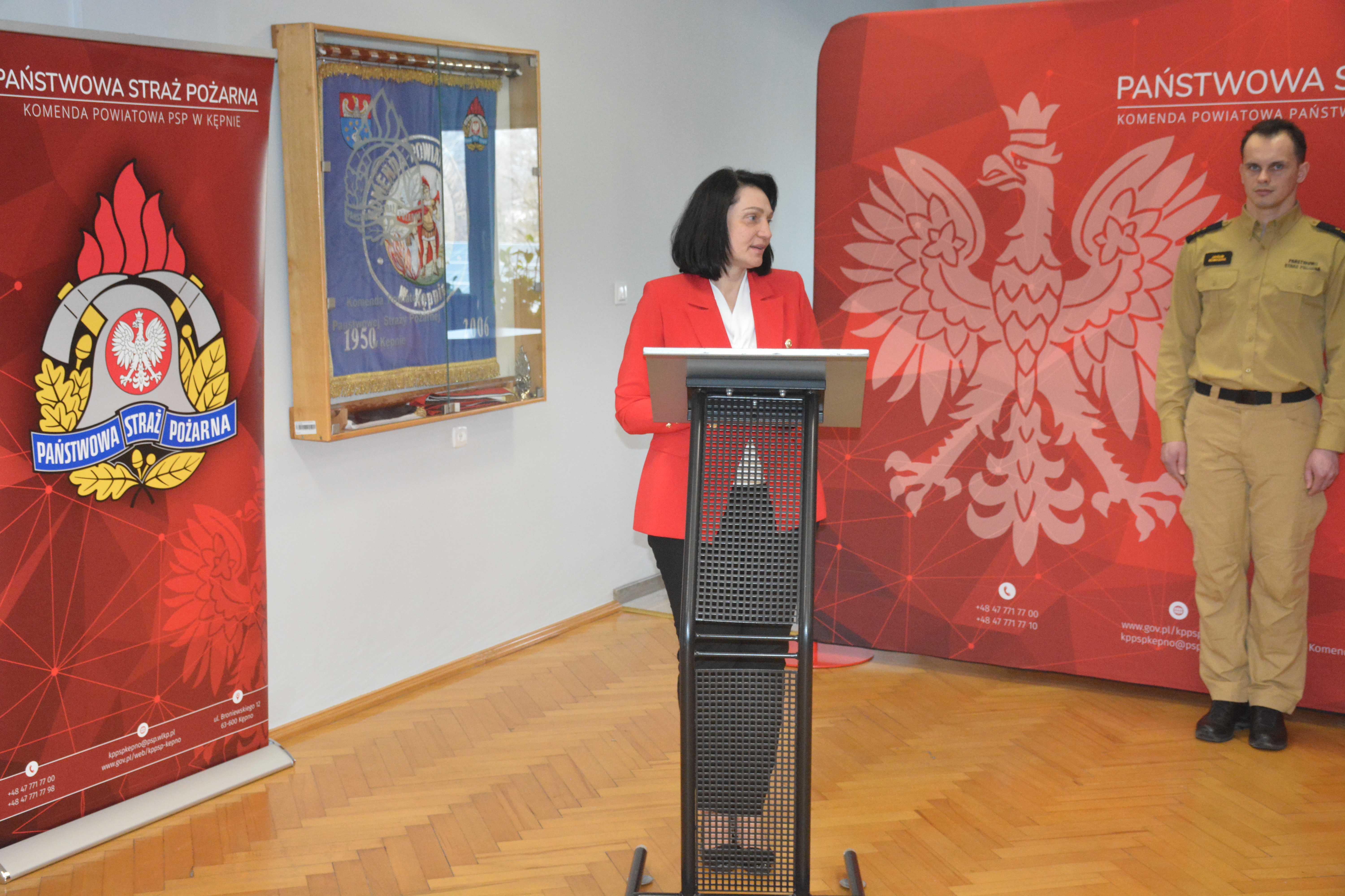 st. bryg. Mariusz Szczepański przybliżył zebranym gościom i funkcjonariuszom zadania oraz przedsięwzięcia realizowane przez Komendę Powiatową Państwowej Straży Pożarnej w Kępnie, omówił działalność każdej z komórek organizacyjnych Komendy, porównał statystyki odnotowanych zdarzeń w minionych latach oraz wskazał zdarzenia charakterystyczne, które miały miejsce w 2024 roku. Wystąpienie było również okazją do podsumowania działań inwestycyjnych oraz poczynionych zakupów w zakresie sprzętu ratowniczo-gaśniczego i szkoleniowego.