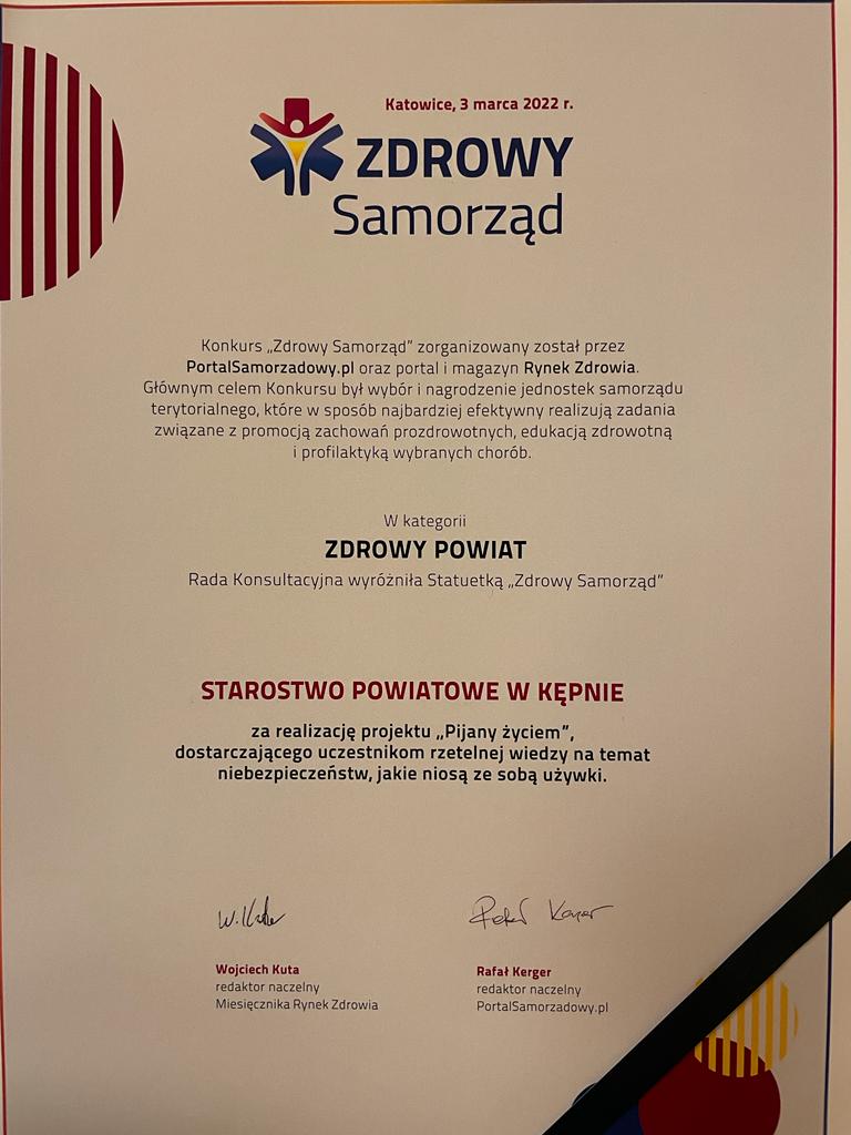 Powiat kępiński został laureatem V edycji konkursu „Zdrowy Samorząd” w kategorii Zdrowy Powiat za realizację projektu "Pijany życiem", dostarczającego uczestnikom rzetelnej wiedzy na temat niebezpieczeństw, jakie niosą ze sobą używki.