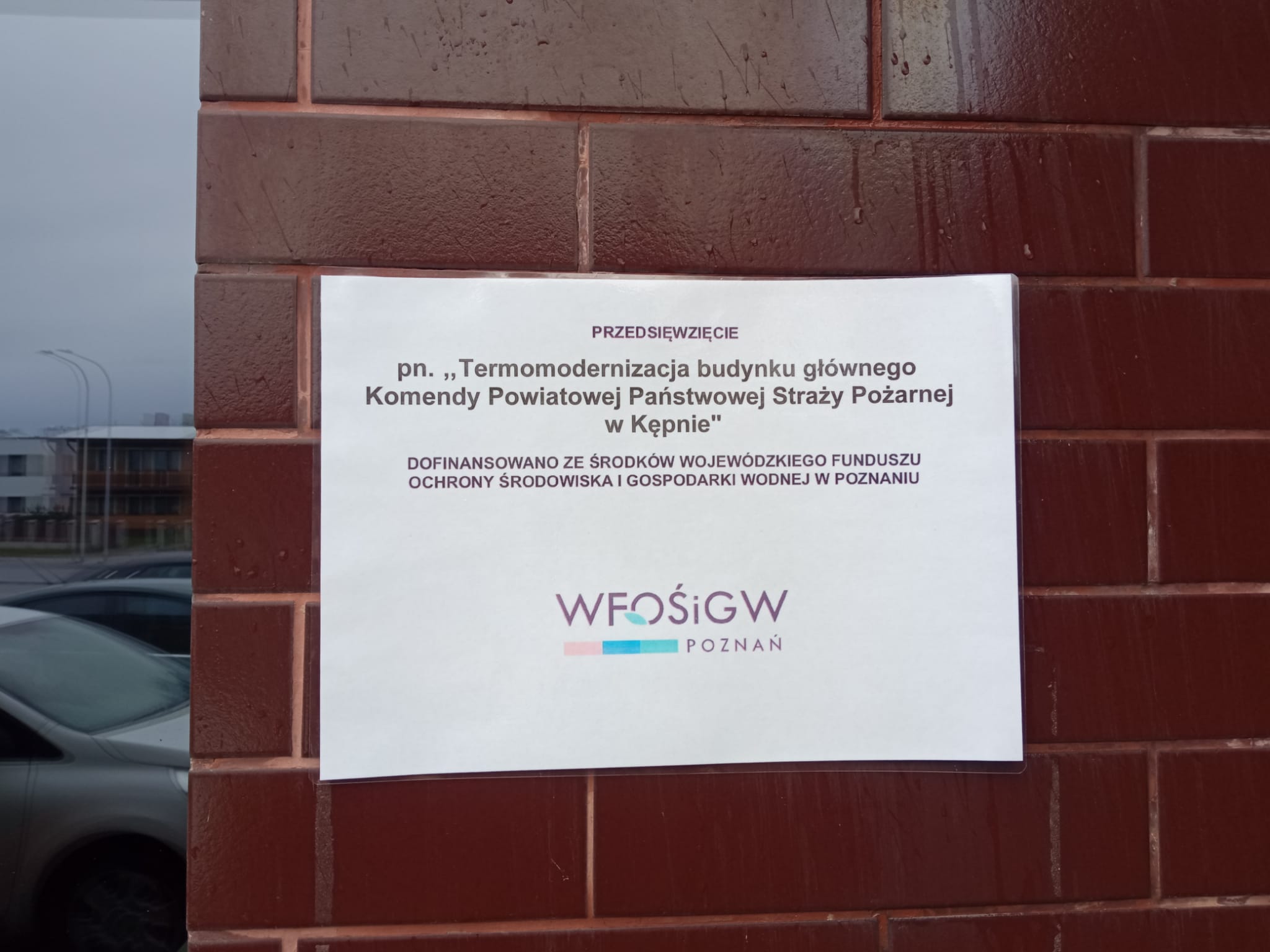 Inwestycja w kwocie 125 006,00 zł pn. "Termomodernizacja budynku głównego Komendy Powiatowej Państwowej Straży Pożarnej w Kępnie" sfinansowana została ze środków Wojewódzkiego Funduszu Ochrony Środowiska i Gospodarki Wodnej w Poznaniu w ramach umowy dotacji na kwotę 90 000,00 zł, środków Powiatu kępińskiego w kwocie 20 000,00 zł oraz środków własnych Komendy Powiatowej Państwowej Straży Pożarnej w Kępnie w kwocie 15 006,00 zł.