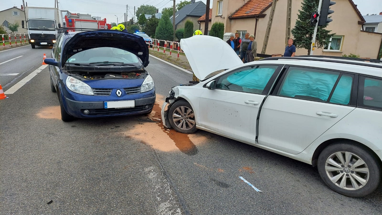 Przybyli na miejsce strażacy zastali dwa samochody osobowe po zderzeniu czołowo-bocznym, 3 osoby biorące udział w zdarzeniu samodzielnie opuściły pojazdy. Działania straży polegały na zabezpieczeniu miejsca zdarzenia, udzieleniu kwalifikowanej pierwszej pomocy osobom biorącym udział w zdarzeniu do czasu przybycia zespołu ratownictwa medycznego. Po przebadaniu przez lekarza jedna osoba została przetransportowana do szpitala. Wyciekające z uszkodzonych pojazdów płyny eksploatacyjne zebrano przy wykorzystaniu sorbentu. Podczas działań DW482 była całkowicie zablokowana.