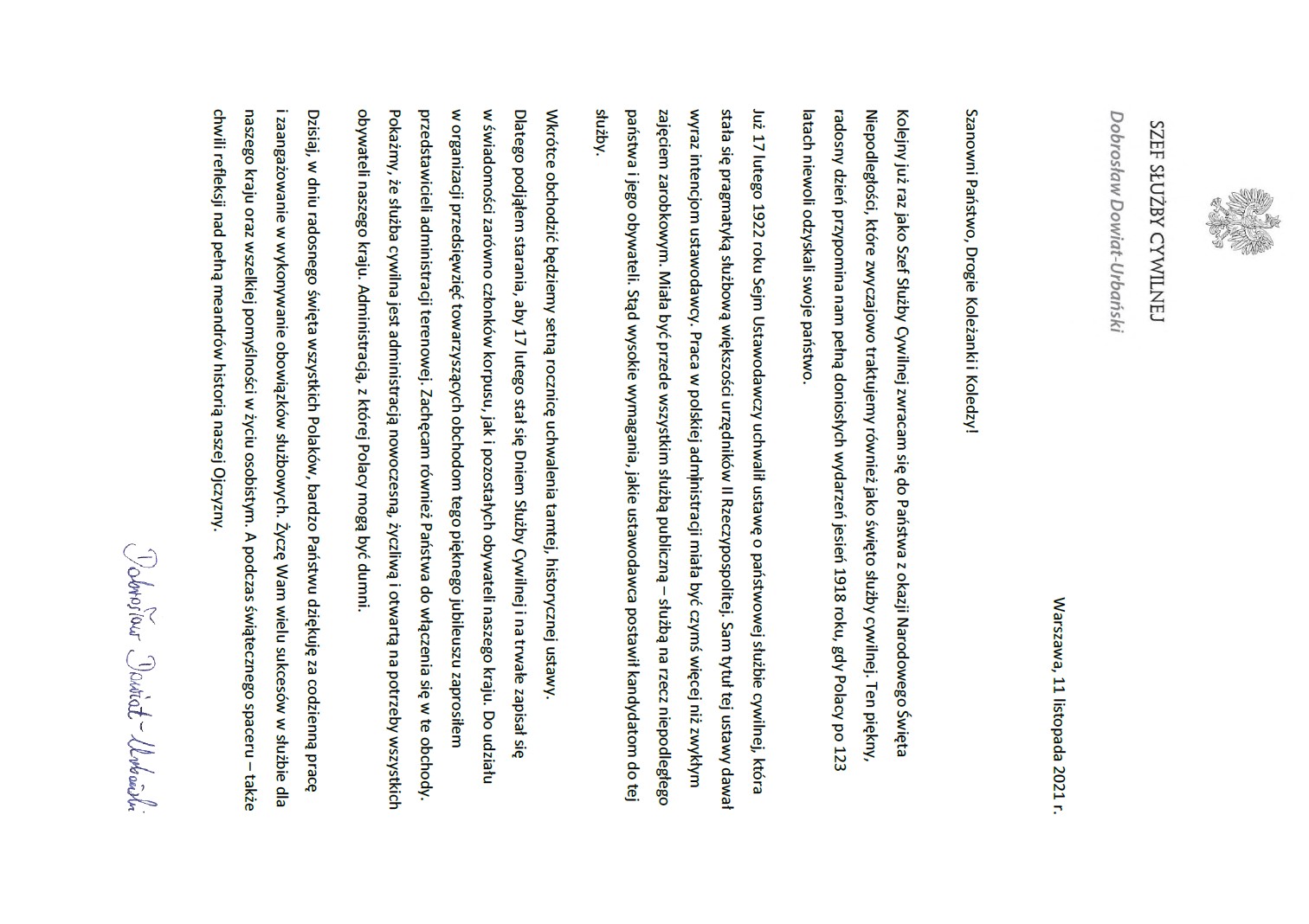 Z okazji 103 rocznicy odzyskania niepodległości przez naszą Ojczyznę oraz obchodów Dnia Służby Cywilnej umieszczamy poniżej pisma i listy.