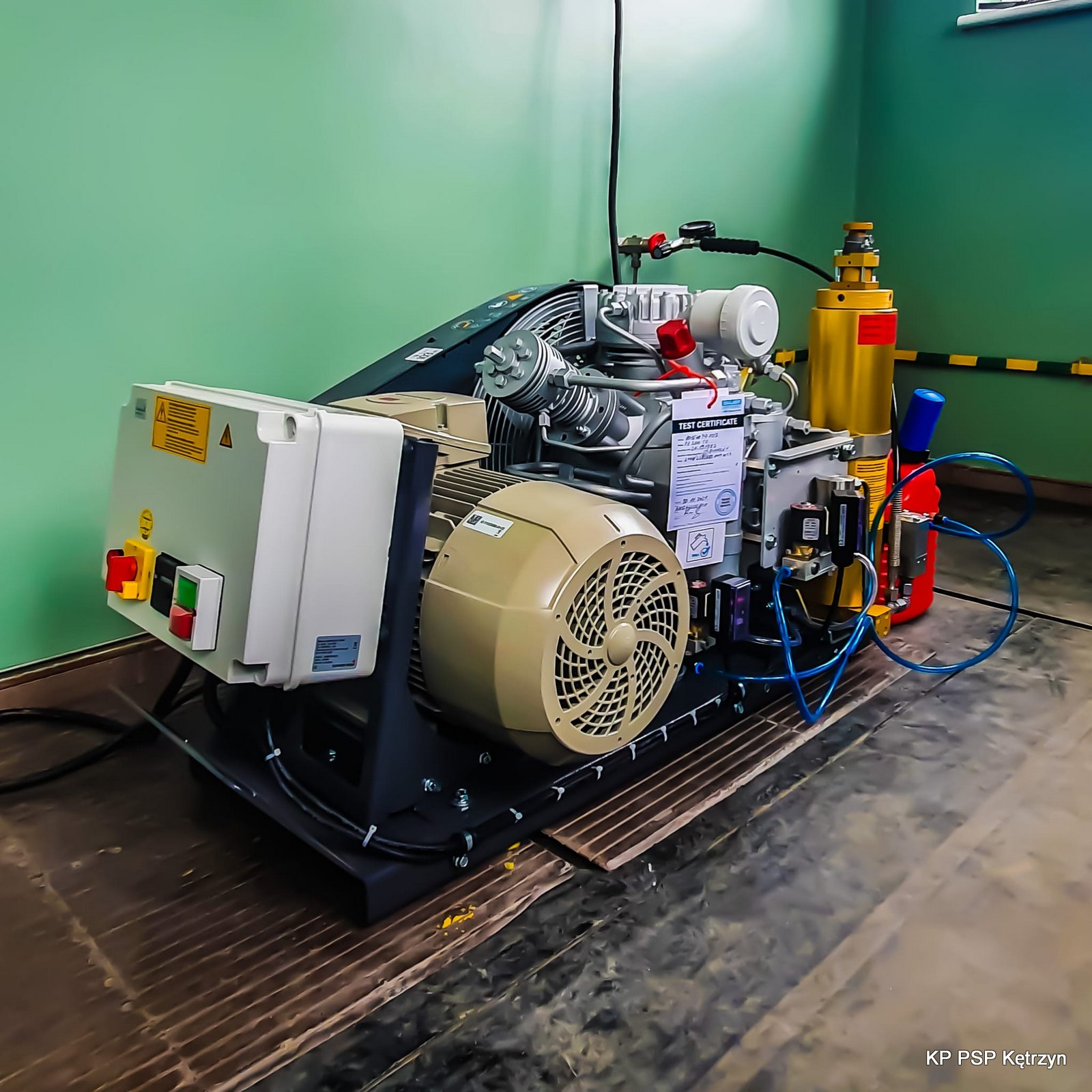 Kompresor do ładowania butli powietrznych zapewni strażakom zapas czystego powietrza podczas działań w strefie niebezpiecznej. Tam gdzie powietrze może być zanieczyszczone strażacy zakładają aparaty Ochrony Dróg Oddechowych do których podłączane są butle napełnione powietrzem z kompresora.