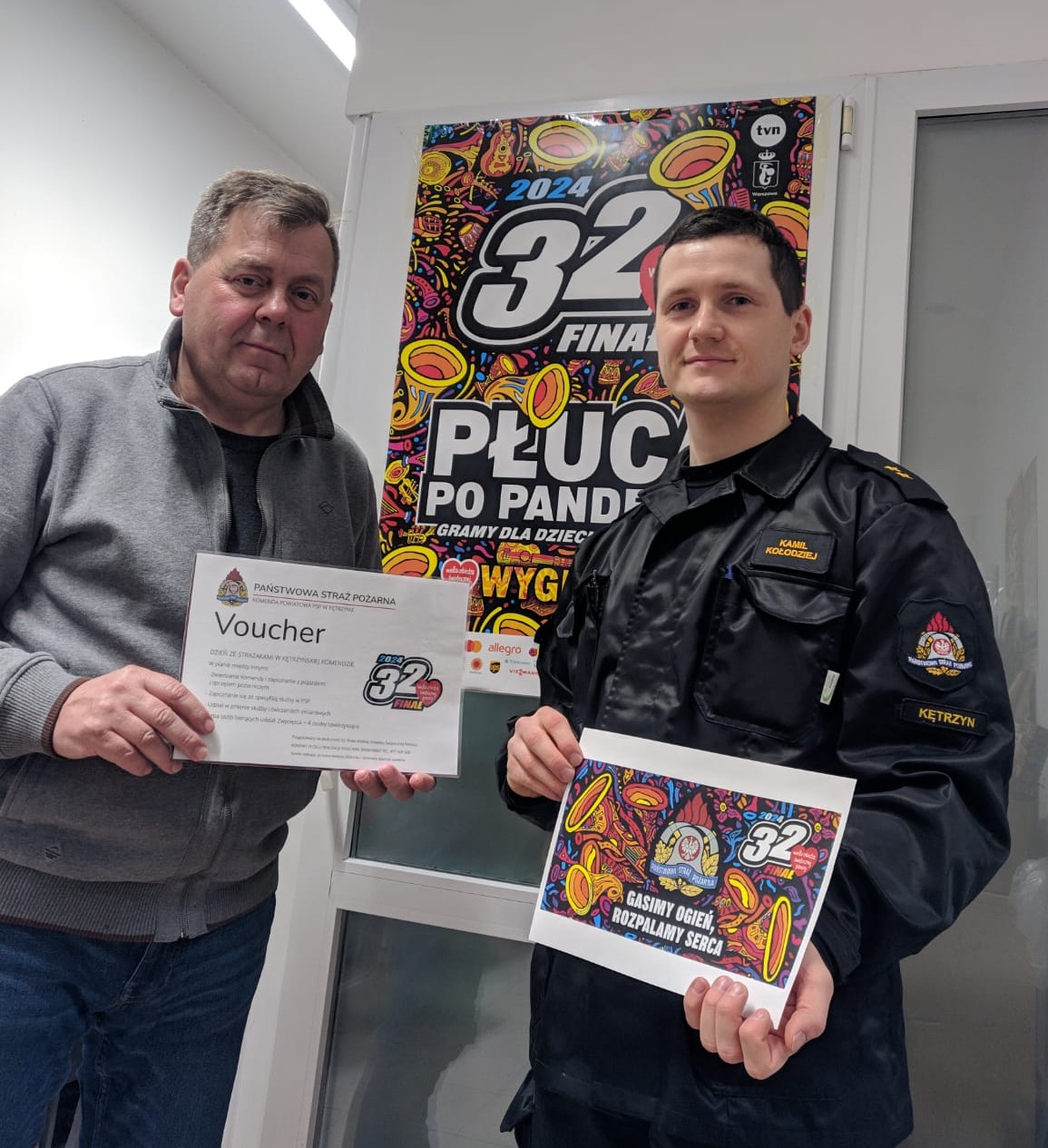 24 stycznia 2024 r. w Sztabie WOŚP w Kętrzynie przekazano przedmioty przygotowane przez Komendę Powiatową PSP w Kętrzynie na licytacje w ramach 32. finału Wielkiej Orkiestry Świątecznej Pomocy. Przekazano dwa vouchery na „Dzień ze strażakami w kętrzyńskiej Komendzie” oraz zestawy upominków strażackich.