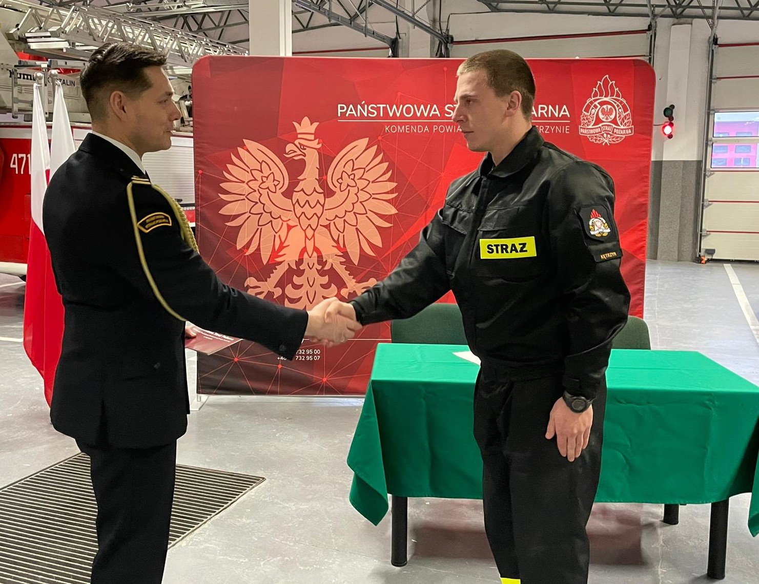 Nowo zatrudnionemu koledze serdecznie gratulujemy i witamy w szeregach Państwowej Straży Pożarnej życząc niegasnącej satysfakcji z pełnionej służby.