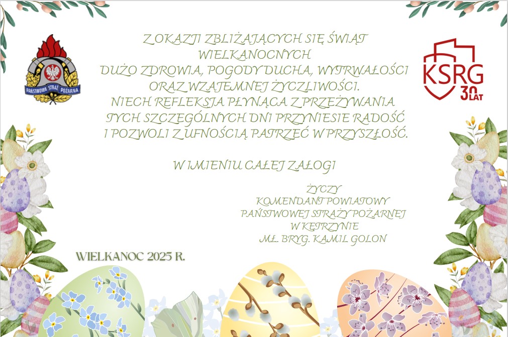 Życzenia Wielkanocne Komendanta Powiatowego PSP w Kętrzynie 18.04.2025 Zdjęcia (1) Pokaż zdjęcie 1 z galerii.