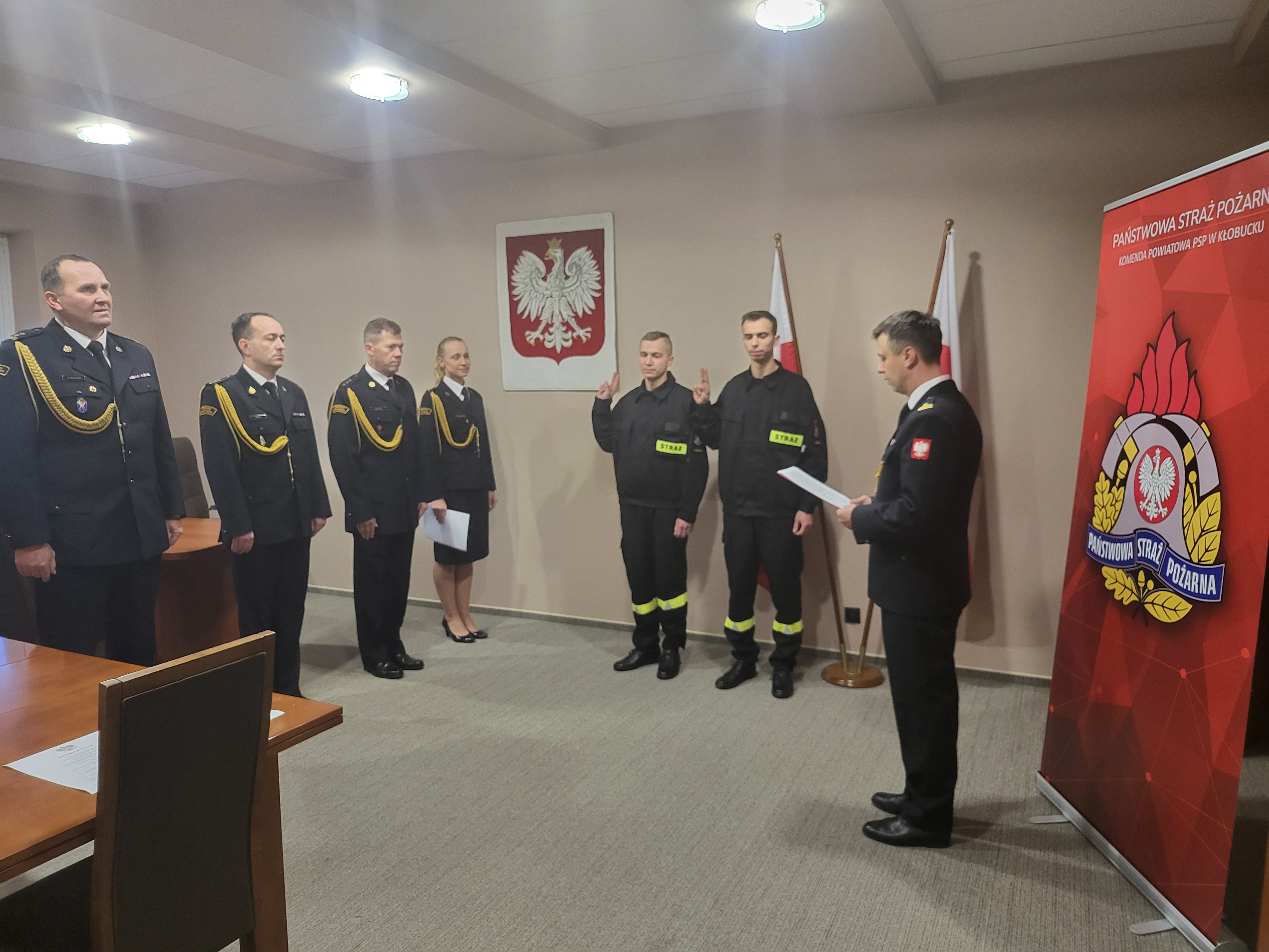 2 grudnia 2022 roku w Komendzie Powiatowej PSP w Kłobucku odbyło się ślubowanie nowo przyjętych strażaków do służby w PSP – str. Krzysztofa Dobosza oraz str. Łukasza Motyla. Ślubowanie przyjął Komendant Powiatowy PSP mł. bryg. Karol Wers w obecności Zastępcy Komendanta Powiatowego PSP w Kłobucku bryg. Romana Królewskiego, dowódcy JRG kpt. Janusza Knopika, Zastępcy dowódcy JRG kpt. Pawła Bargiela oraz Kierownika sekcji organizacyjno-kadrowej mł. kpt. Agnieszki Grzelińskiej-Ryszczyk.