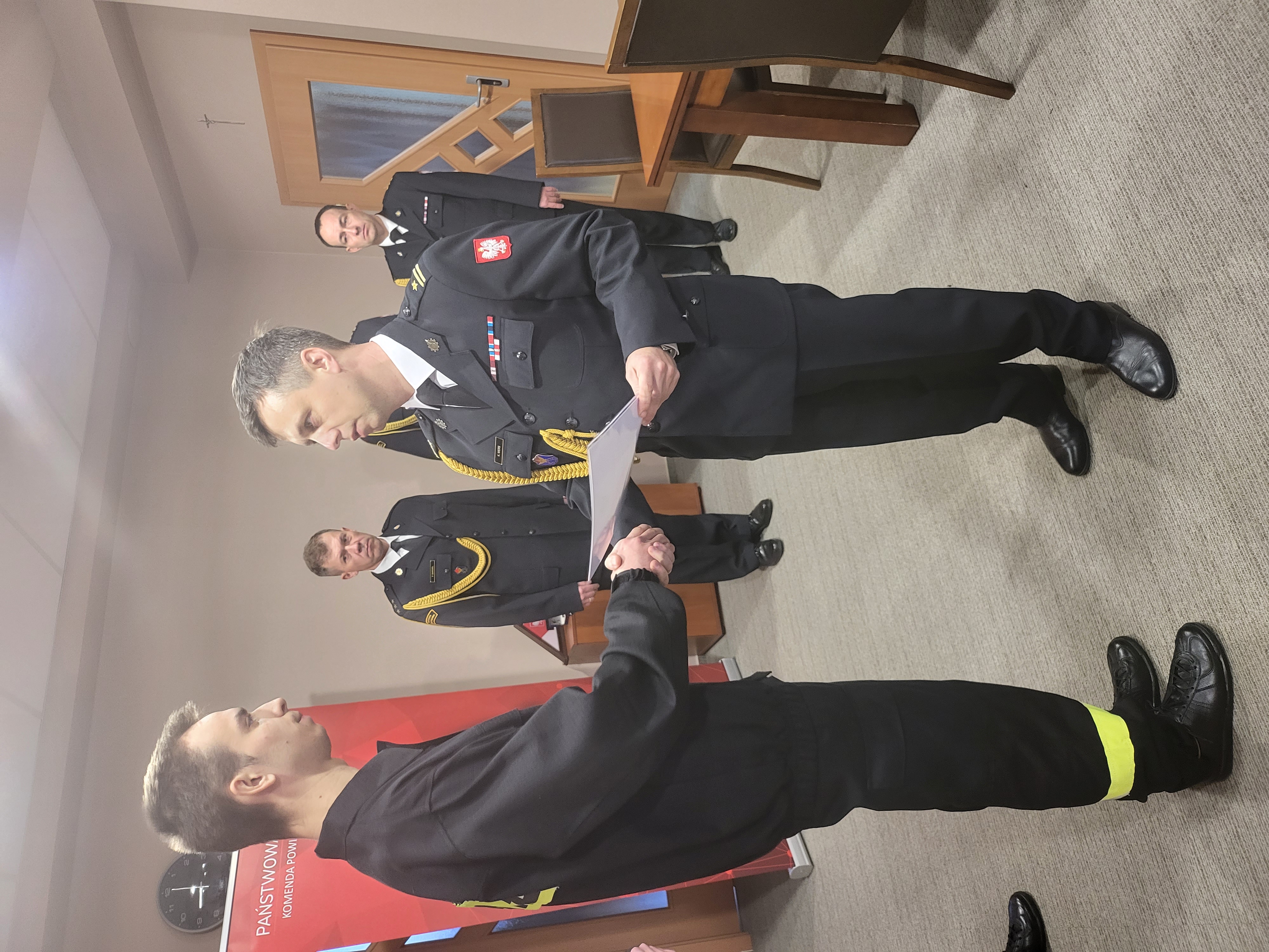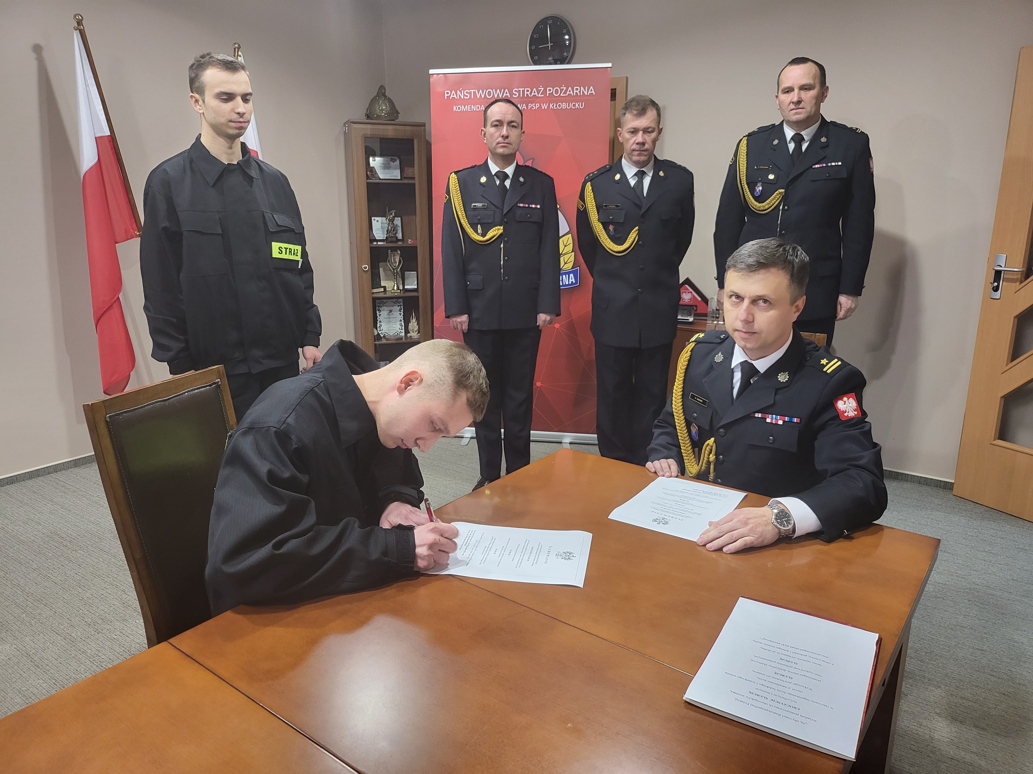 Następnie strażak złożył podpis pod aktem ślubowania, pieczętując ten ważny moment w karierze zawodowej.