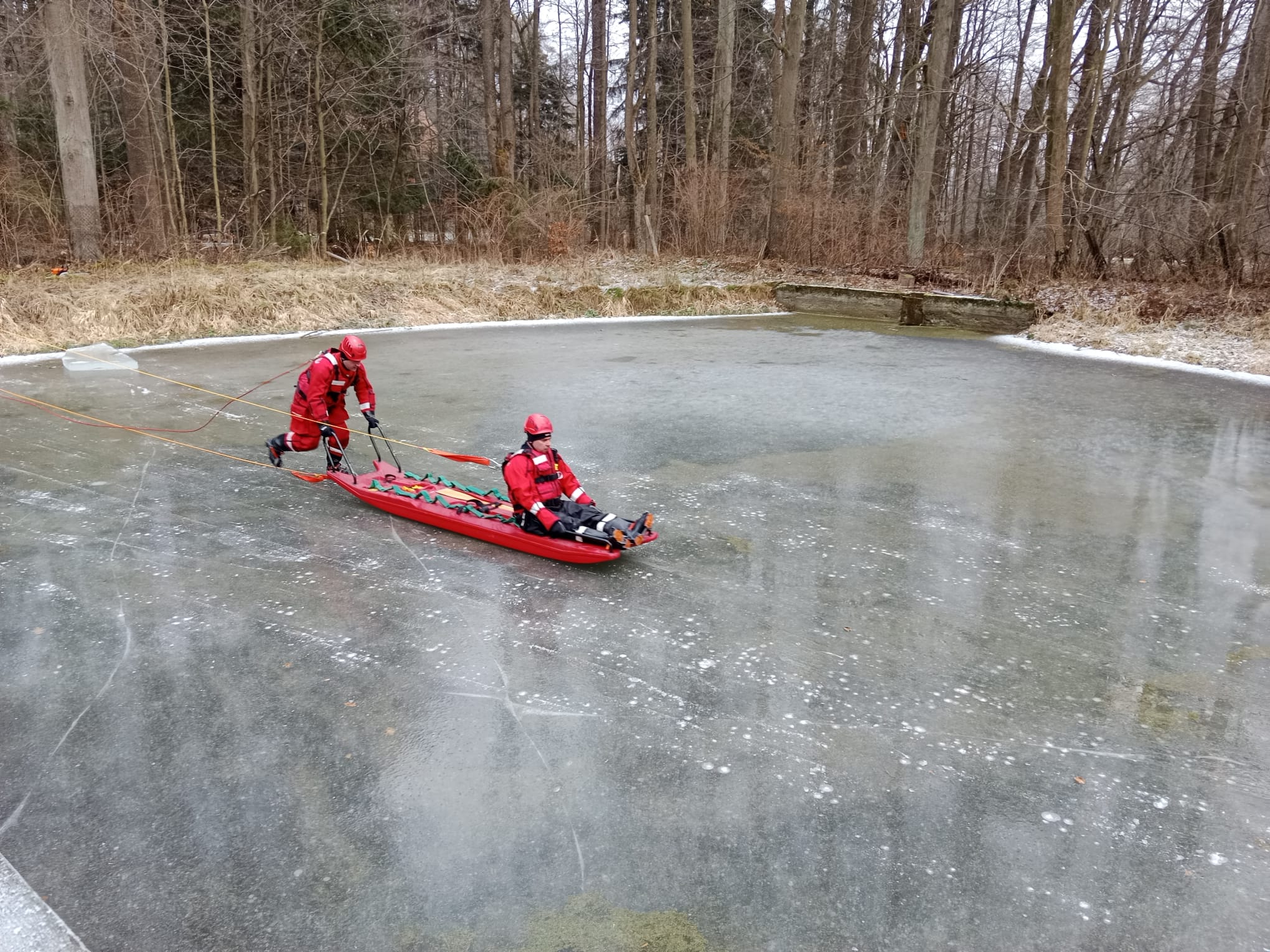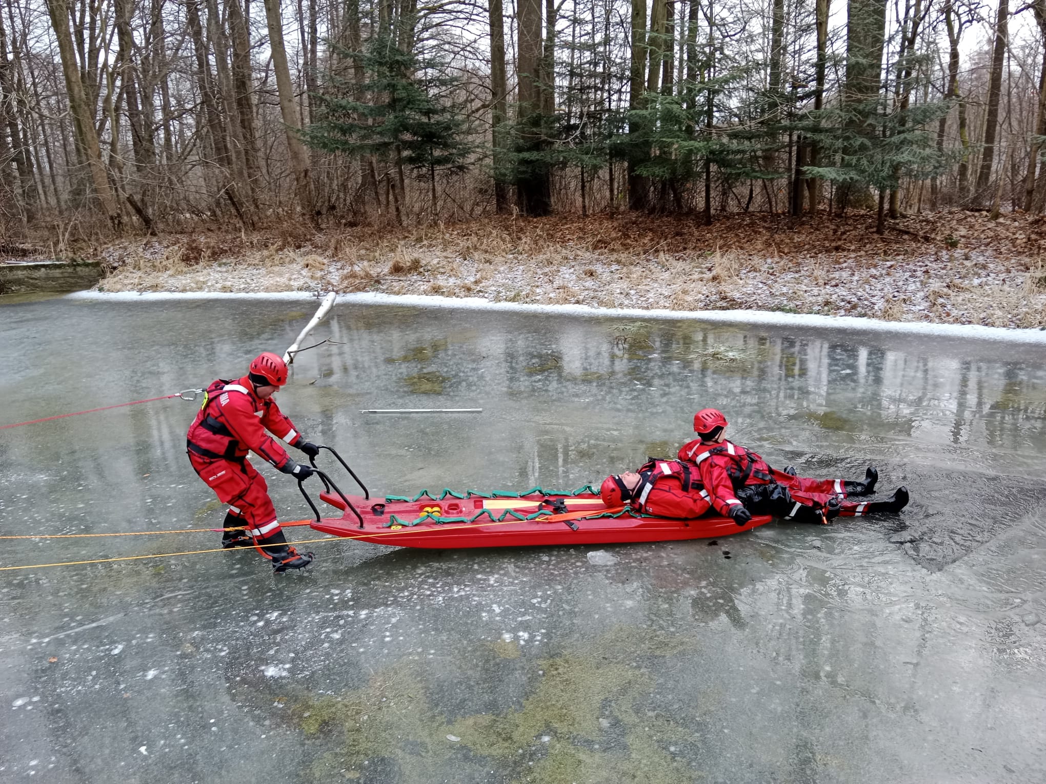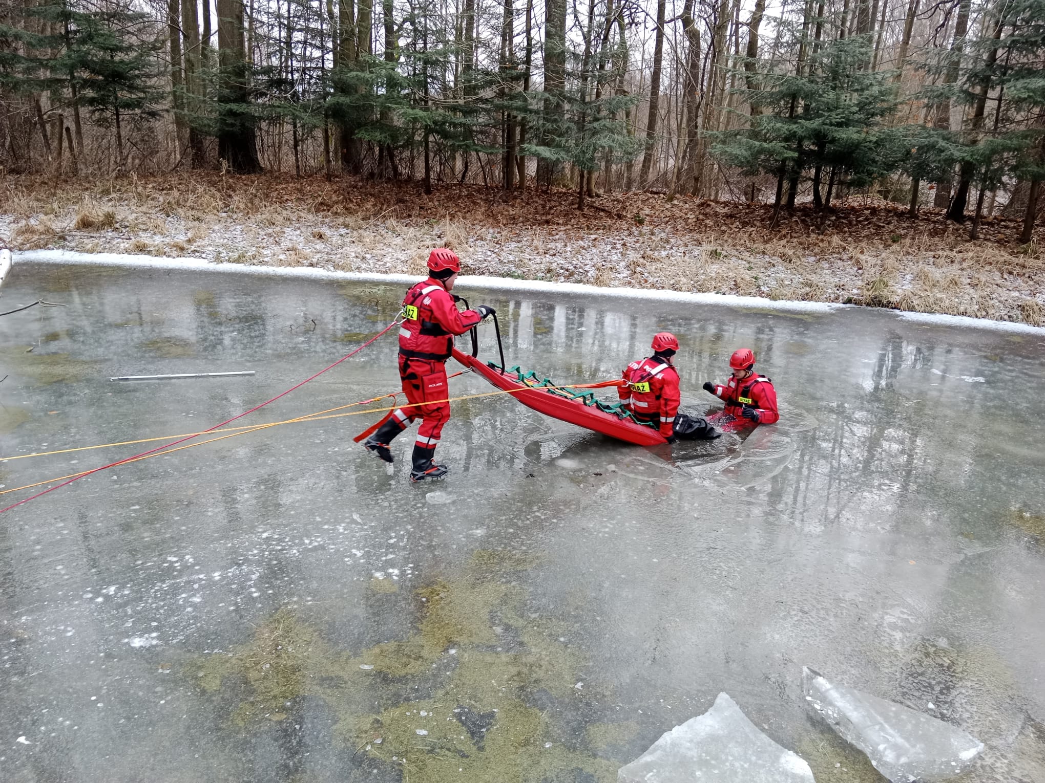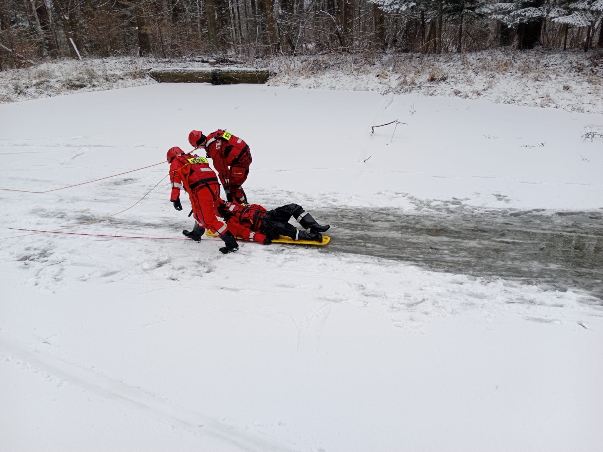 W dniach 19-21.01.2022 r. na terenie zbiornika przeciwpożarowego leśnictwa Długopole Dolne, odbyły się w ramach doskonalenia zawodowego ćwiczenia z zakresu ratownictwa lodowego, w których udział wzięły wszystkie zmiany służbowe Jednostki Ratowniczo-Gaśniczej Państwowej Straży Pożarnej w Bystrzycy Kłodzkiej. Podczas ćwiczeń poruszono m.in. takie obszary jak bezpieczeństwo i higiena służby podczas tego typu działań, procedury ratownicze z zakresu kwalifikowanej pierwszej pomocy przy wychłodzeniu i tonięciu czy techniki ewakuacji poszkodowanego. Ćwiczenia były doskonałą okazją do utrwalenia umiejętności praktycznych strażaków z tego zakresu.