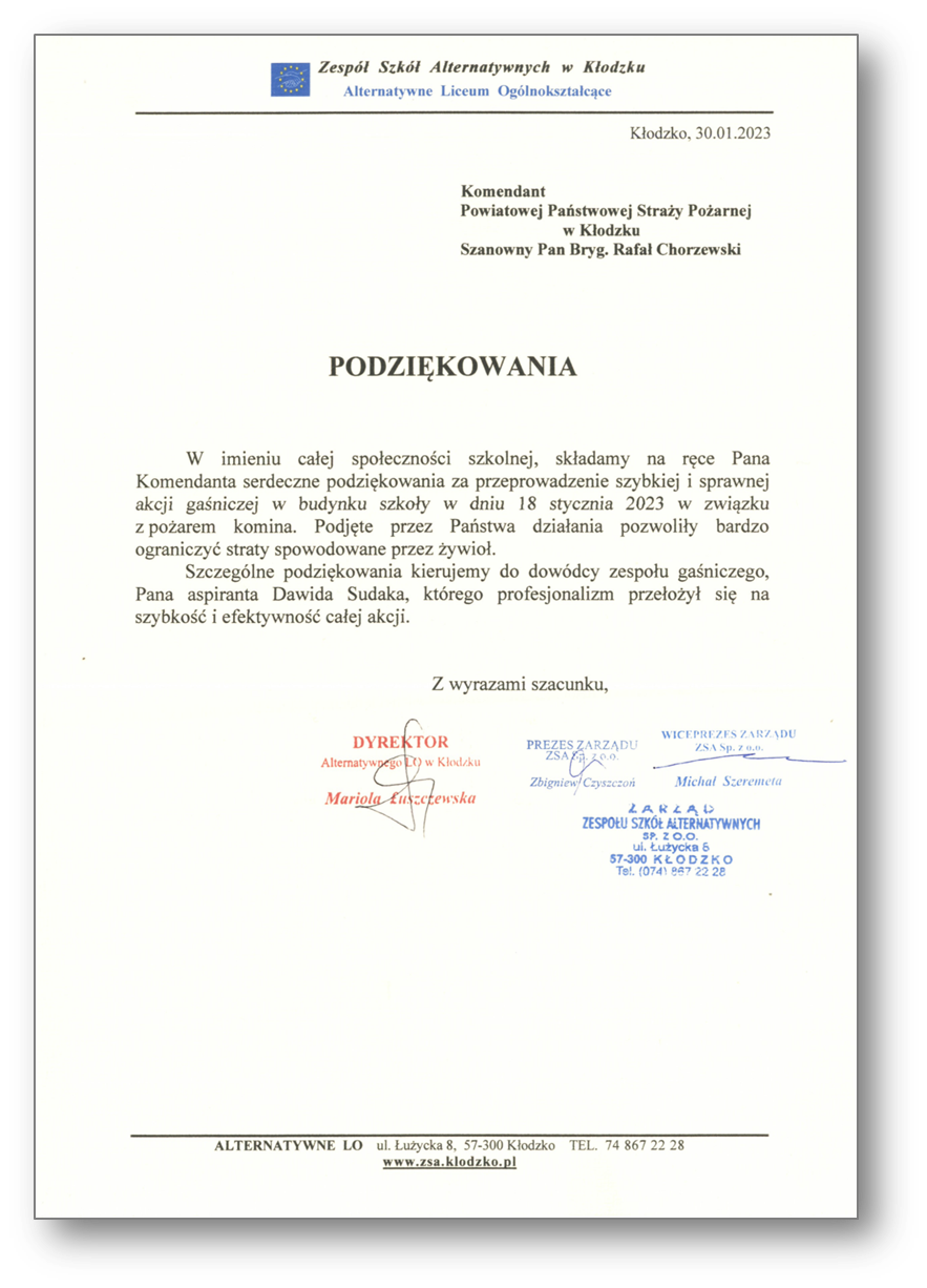 W następnej kolejności na ręce asp. Dawida Sudaka – Dowódcy Zmiany I Jednostki Ratowniczo-Gaśniczej PSP w Kłodzku wręczono podziękowanie jakie wpłynęło do siedziby Komendy Powiatowej PSP w Kłodzku od Zarządu Zespołu Szkół Alternatywnych w Kłodzku Sp. z o.o. W dniu 18 stycznia br. funkcjonariusze Zamiany I pod dowództwem asp. Dawida Sudaka uczestniczyli w zdarzeniu związanym z pożarem sadzy w przewodzie kominowym w budynku Zespołu Szkół Alternatywnych w Kłodzku przy ul. Łużyckiej 6. Profesjonalnie dowodzona i przeprowadzona akcja ratowniczo-gaśnicza przyczyniła się niewątpliwe do szybkiego opanowania pożaru oraz maksymalnego ograniczenia strat materialnych.