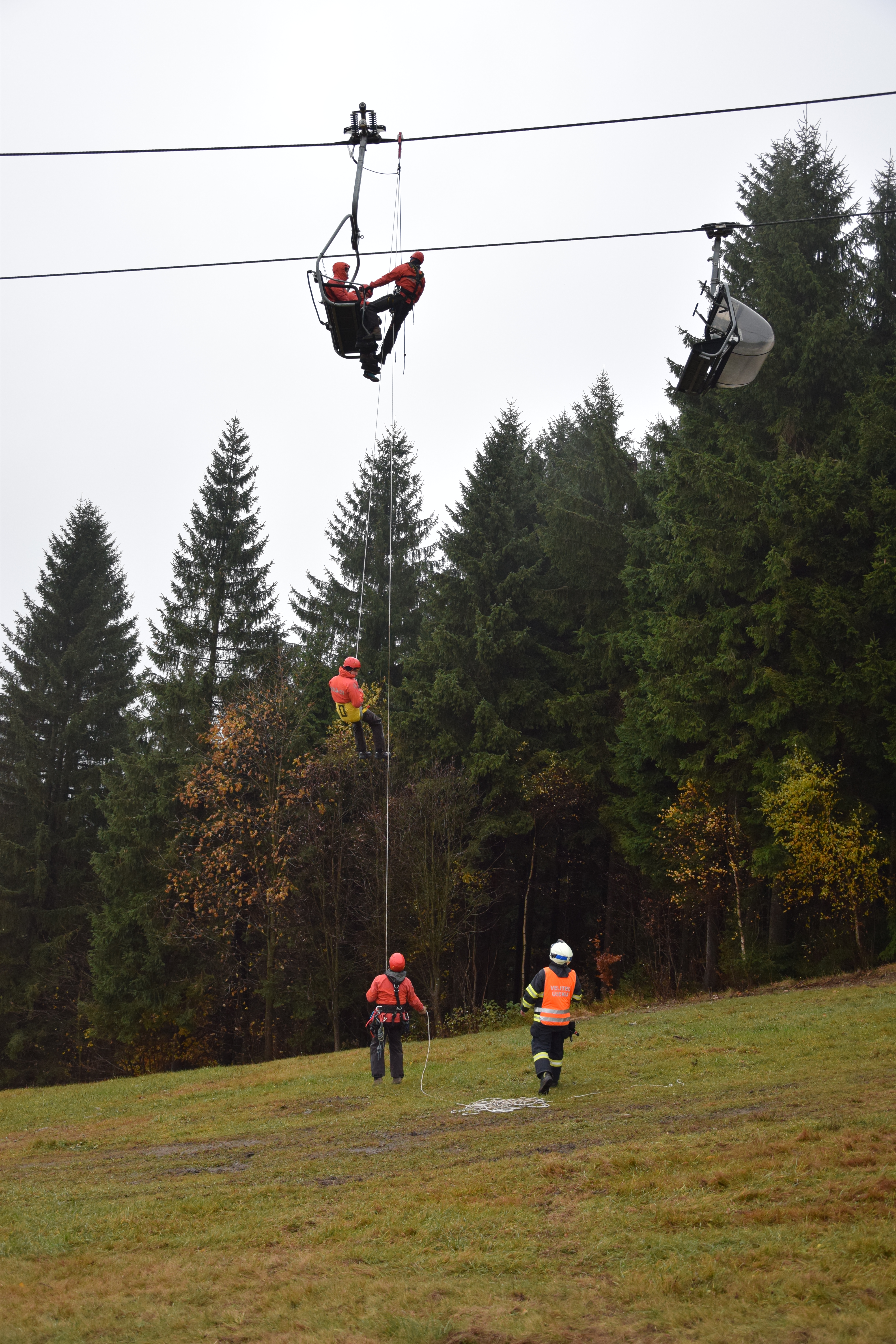 W międzyczasie, wraz z przybyciem na miejsce ćwiczeń kolejnych sił i środków czescy strażacy (ratownicy wysokościowi) oraz służba górska, rozpoczęli ewakuację pozostałych osób - uwięzionych na wysokości w krzesełkach kolei linowej. Przy użyciu sprzętu wysokościowego i technik alpinistycznych sukcesywnie docierali do poszkodowanych, opuszczając ich na ziemię. Większość z nich była zmarznięta, lecz w stosunkowo dobrej kondycji zdrowotnej.
