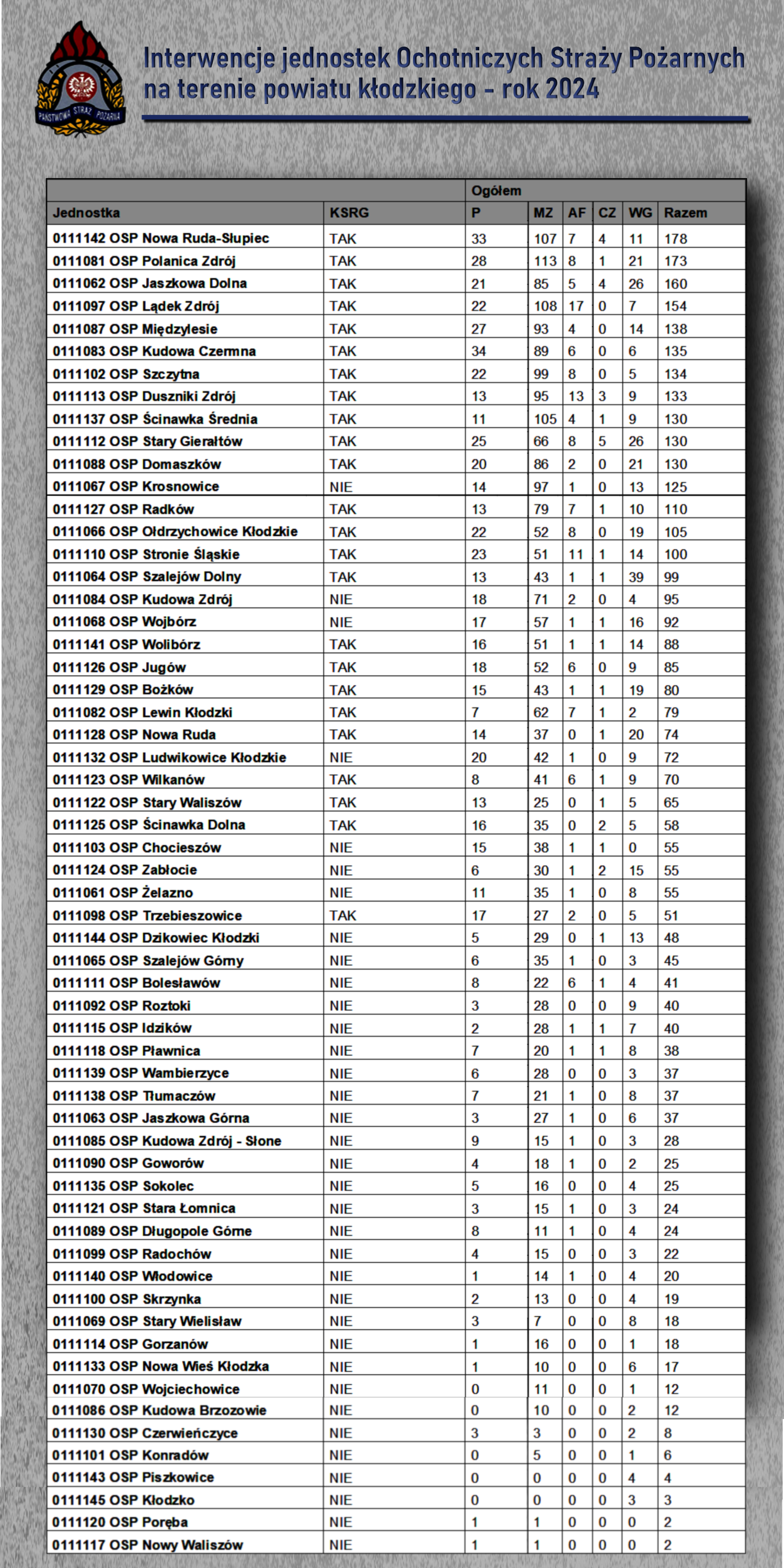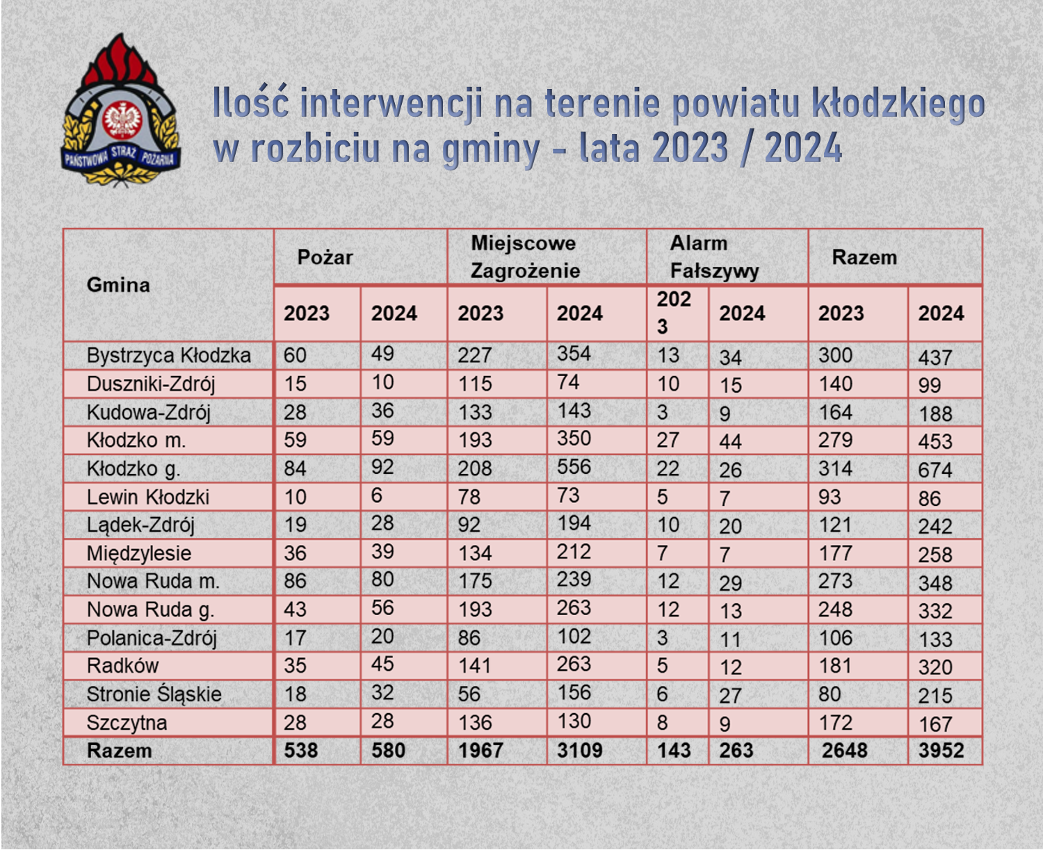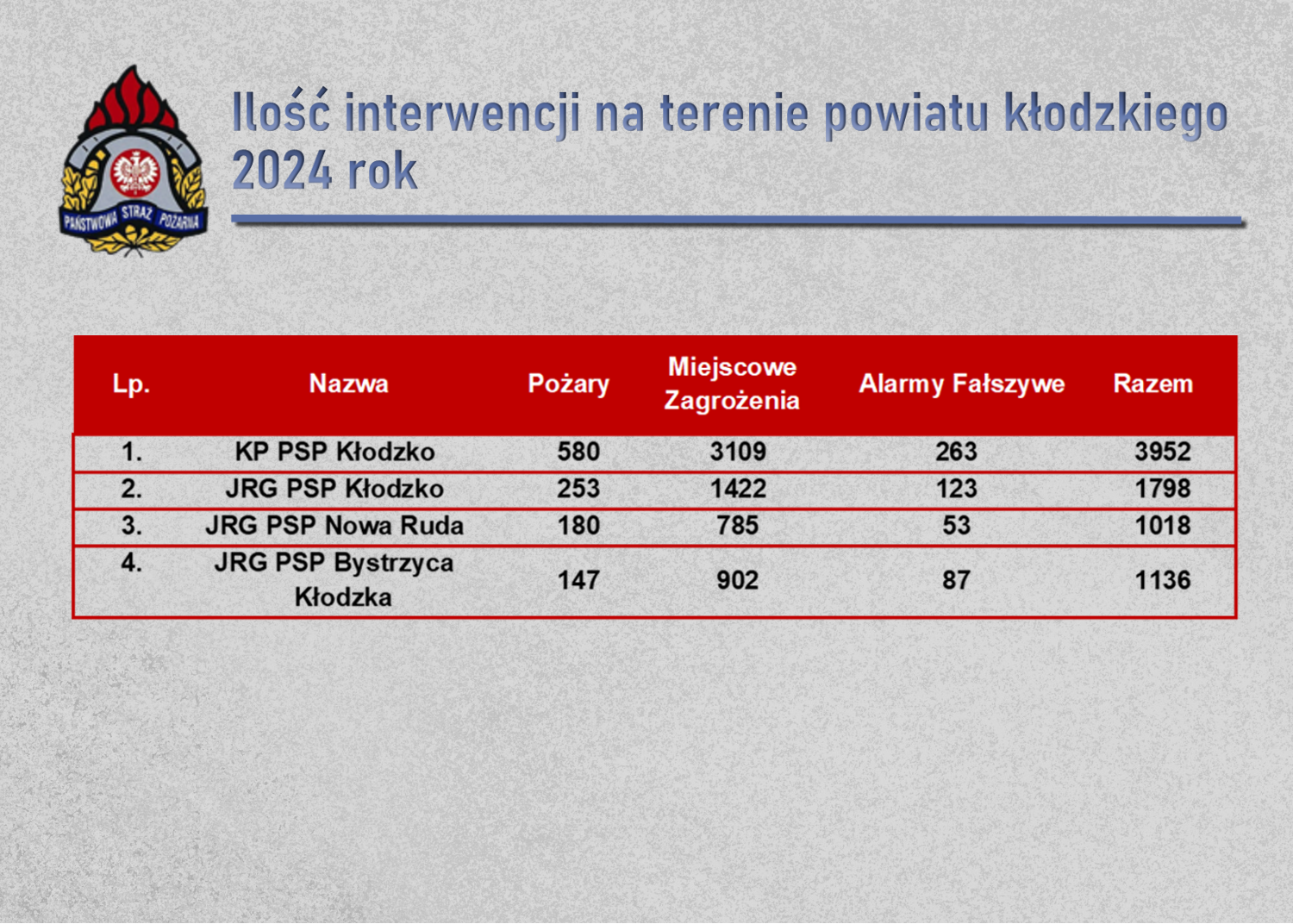 Statystyka interwencji Jednostek Ochrony Przeciwpożarowej z terenu powiatu kłodzkiego za rok 2024 24.01.2025 Zdjęcia (4) Pokaż zdjęcie 1 z galerii. Pokaż zdjęcie 2 z galerii. Pokaż zdjęcie 3 z galerii. Pokaż zdjęcie 4 z galerii.