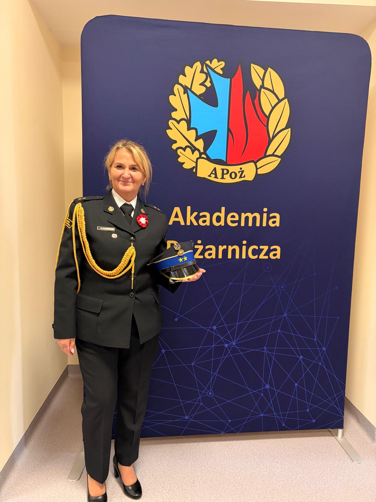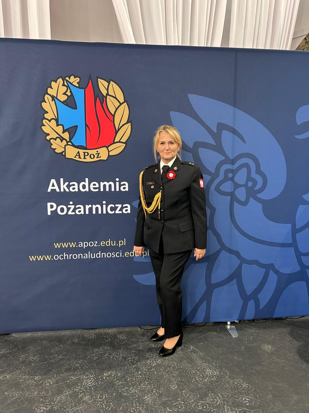 Mł. kpt. Kinga Pawlak w czerwcu br. ukończyła w Akademii Pożarniczej przeszkolenie zawodowe przygotowujące do zajmowania stanowisk oficerskich w Państwowej Straży Pożarnej (SPO). Obecnie kieruje Wydziałem Organizacyjno-Kadrowym w naszej Komendzie.