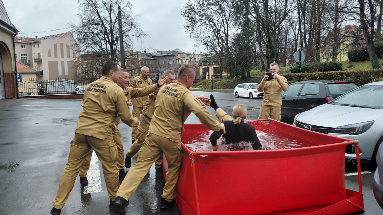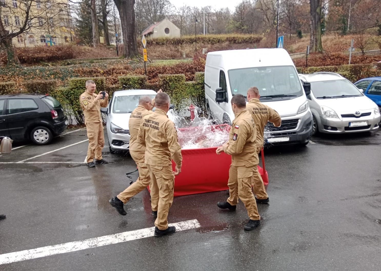 Tradycyjnie koledzy z Jednostki Ratowniczo-Gaśniczej w Kłodzku przygotowali uroczystą „kąpiel” w zbiorniku wodnym, stanowiącą humorystyczny i symboliczny element świętowania awansu.
