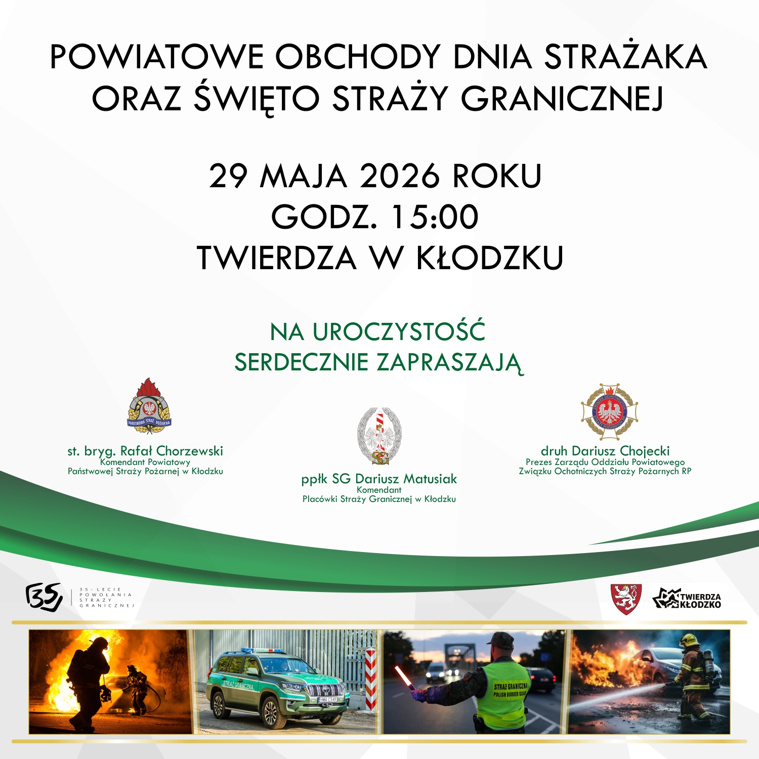 Serdecznie zapraszamy mieszkańców powiatu kłodzkiego na Powiatowe Obchody Dnia Strażaka oraz Święto Straży Granicznej, które odbędą się w dniu 29 maja 2026 r. o godz. 15.00 na terenie Twierdzy w Kłodzku.