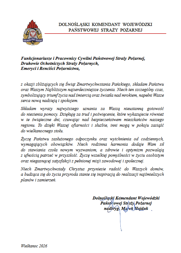 Życzenia Dolnośląskiego Komendanta Wojewódzkiego Państwowej Straży Pożarnej