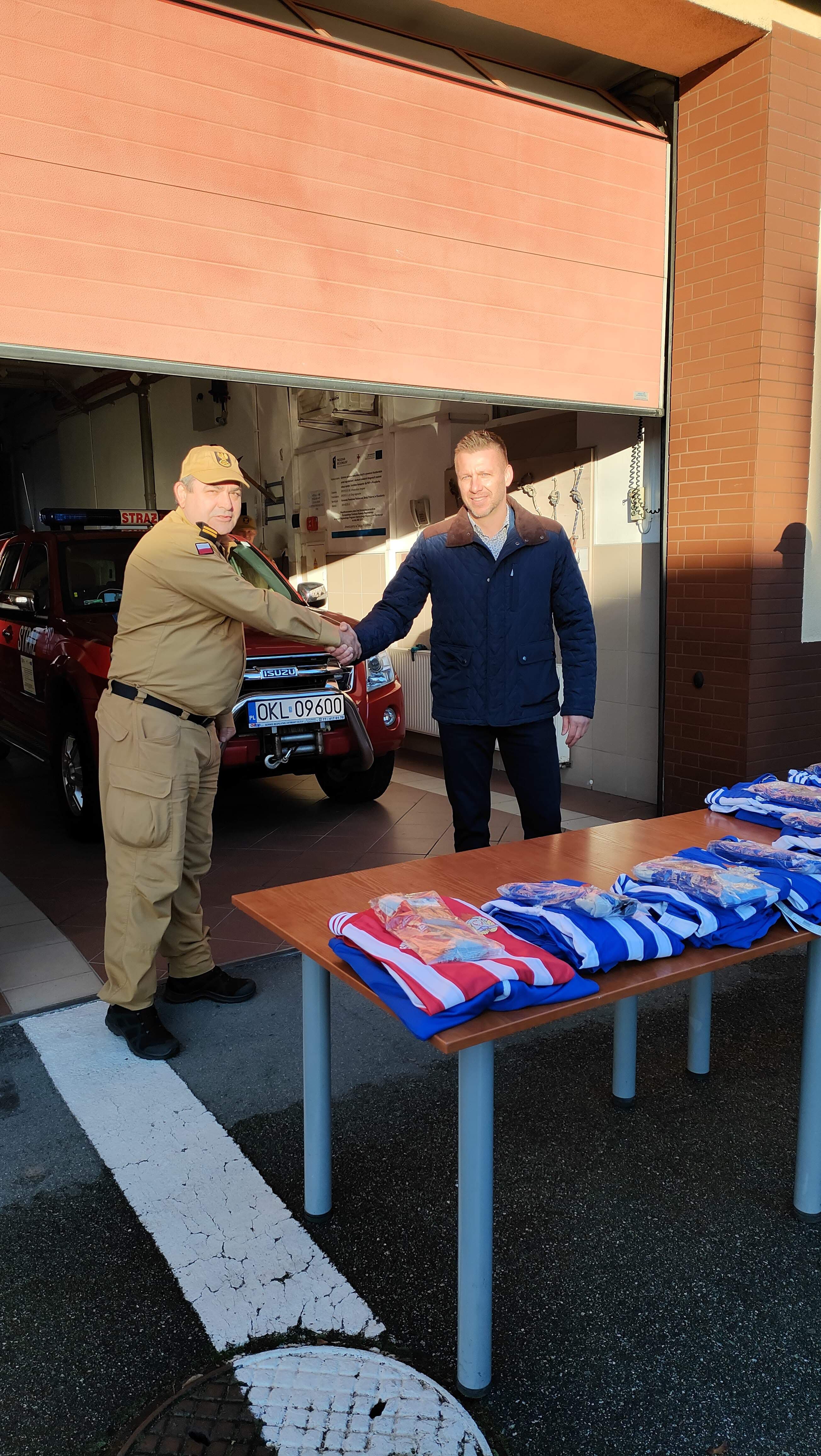 Wysokiej klasy zestaw sportowy został wręczony przez Pana Krzysztofa Stodołę, który podczas przekazania życzył kolejnych sukcesów zwycięskiej drużynie. Wręczenie odbyło się na placu kluczborskiej komendy w obecności Komendanta Powiatowego PSP w Kluczborku bryg. Marka Kocielskiego.