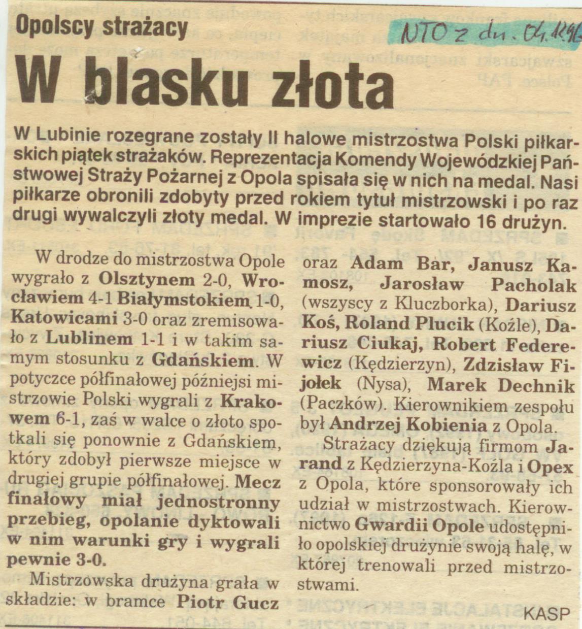 Inicjatorem i twórcą rozgrywek piłki nożnej w strukturach Straży Pożarnej była Komenda Wojewódzka PSP w Zabrzu. Tam też odbyły się pierwsze Mistrzostwa Polski pod banderą Komendy Głównej. Z czasem piłka nożna wpisała sie na trwałe do kalendarza imprez sportowych organizowanych przez KG PSP. Dyscyplina ta cieszyła się bardzo dużym zainteresowaniem wśród kluczborskich strażaków. Na arenie krajowej prezentowali bardzo wysoki poziom, zdobywając liczne puchary i medale. Przez wiele lat trzon reprezentacji województwa opolskiego stanowiła kadra z Kluczborka: Adam Bar, Piotr Gucz, Janusz Kamosz, Jarosław Pacholak. Oto kalendarium mistrzostw, podczas których opolskie znajdowało się w czołówce: