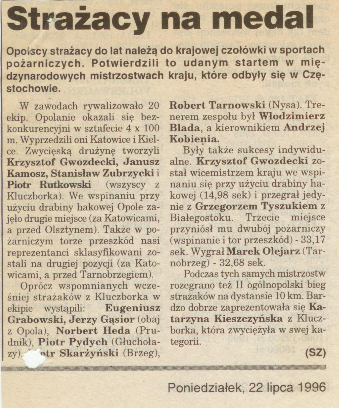 1996 – XIII Mistrzostwa Polski w Sporcie Pożarniczym w Częstochowie. Do reprezentacji woj.opolskiego zostali powołani m.in. Krzysztof Gwozdecki, Stanisław Zubrzycki, Janusz Kamosz, Piotr Rutkowski.