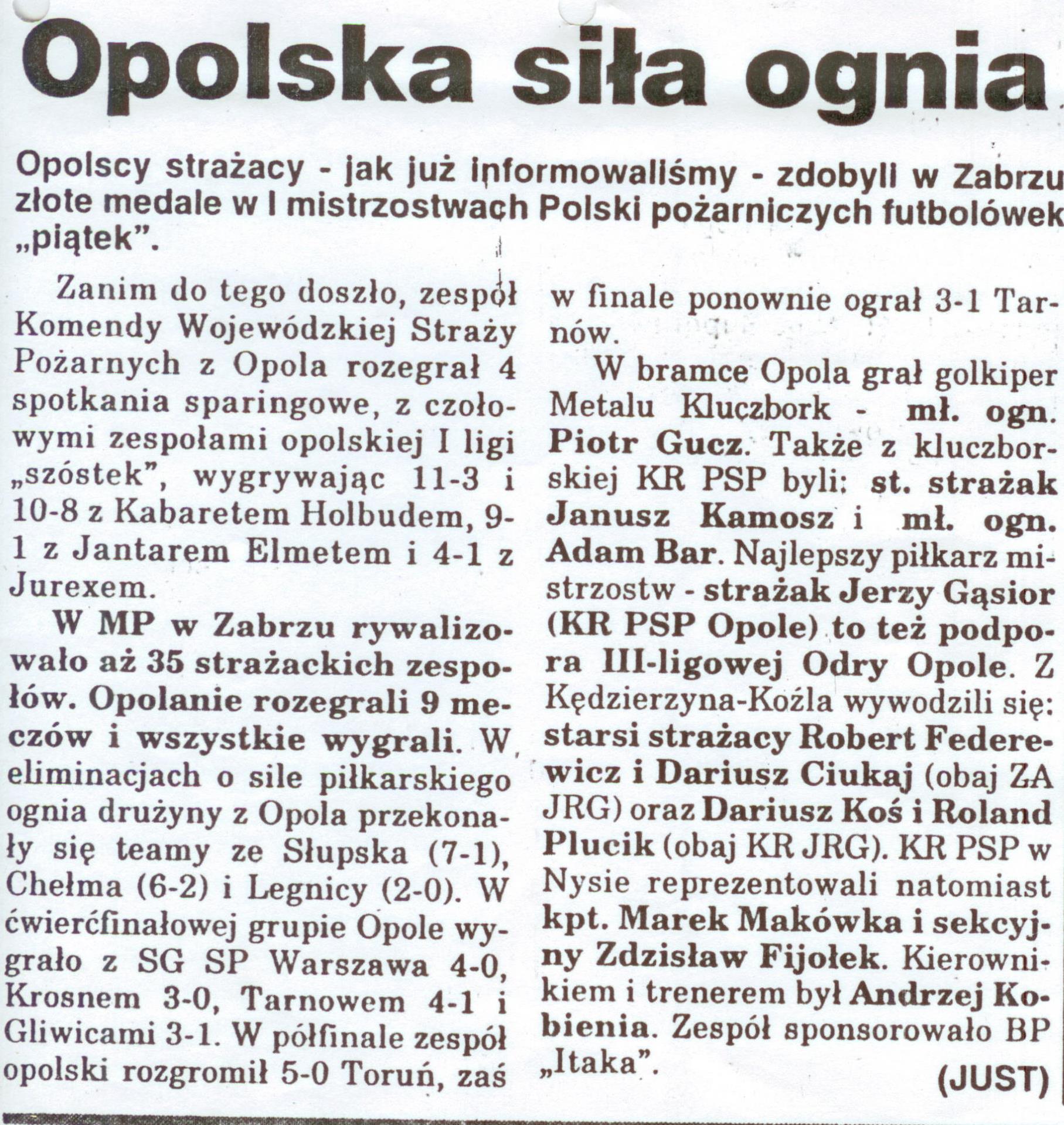 - Drużyna z województa Opolskiego zdobyła II miejsce drużynowo i III miejsce w sztafecie pożarniczej, komendę z kluczborka reprezentowali: Krzysztof Gwozdecki, Stanisław Zubrzycki, Jerzy Kujawa.