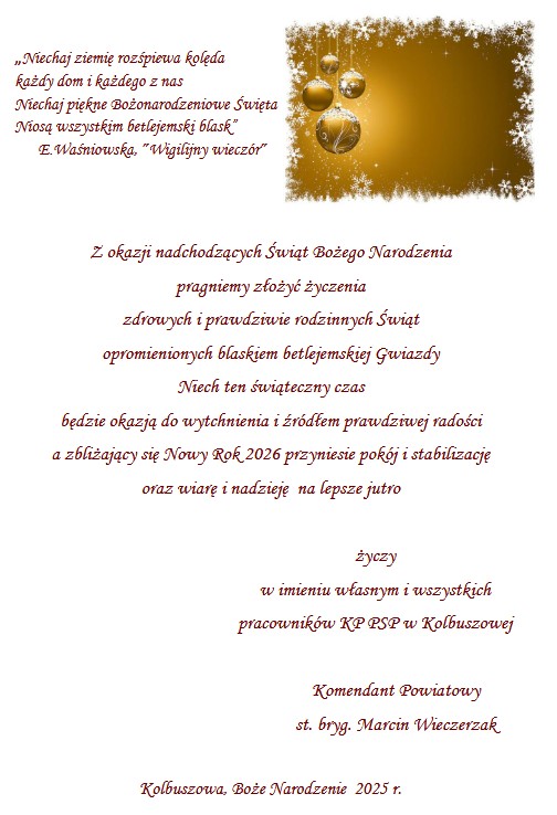 Życzenia świąteczne Komendanta Powiatowego PSP w Kolbuszowej