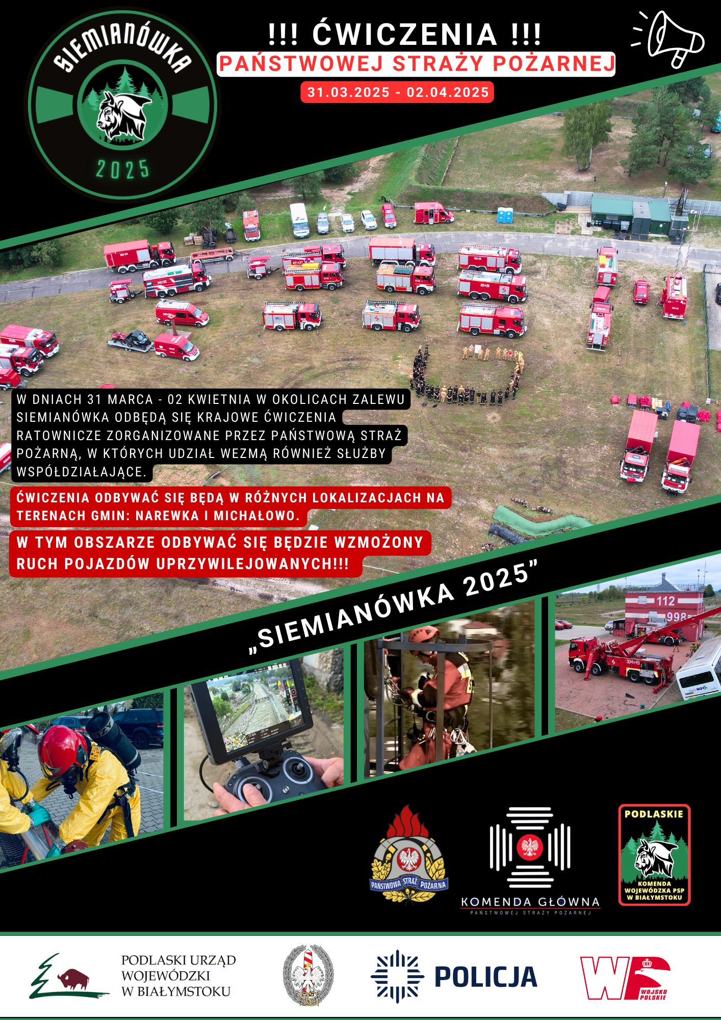 Komenda Wojewódzka Państwowej Straży Pożarnej w Białymstoku informuje, że w dniach 31 marca – 2 kwietnia 2025 r. odbędą się krajowe ćwiczenia ratownicze centralnego odwodu operacyjnego Krajowego Systemu Ratowniczo-Gaśniczego, pod kryptonimem „SIEMIANÓWKA 2025”.